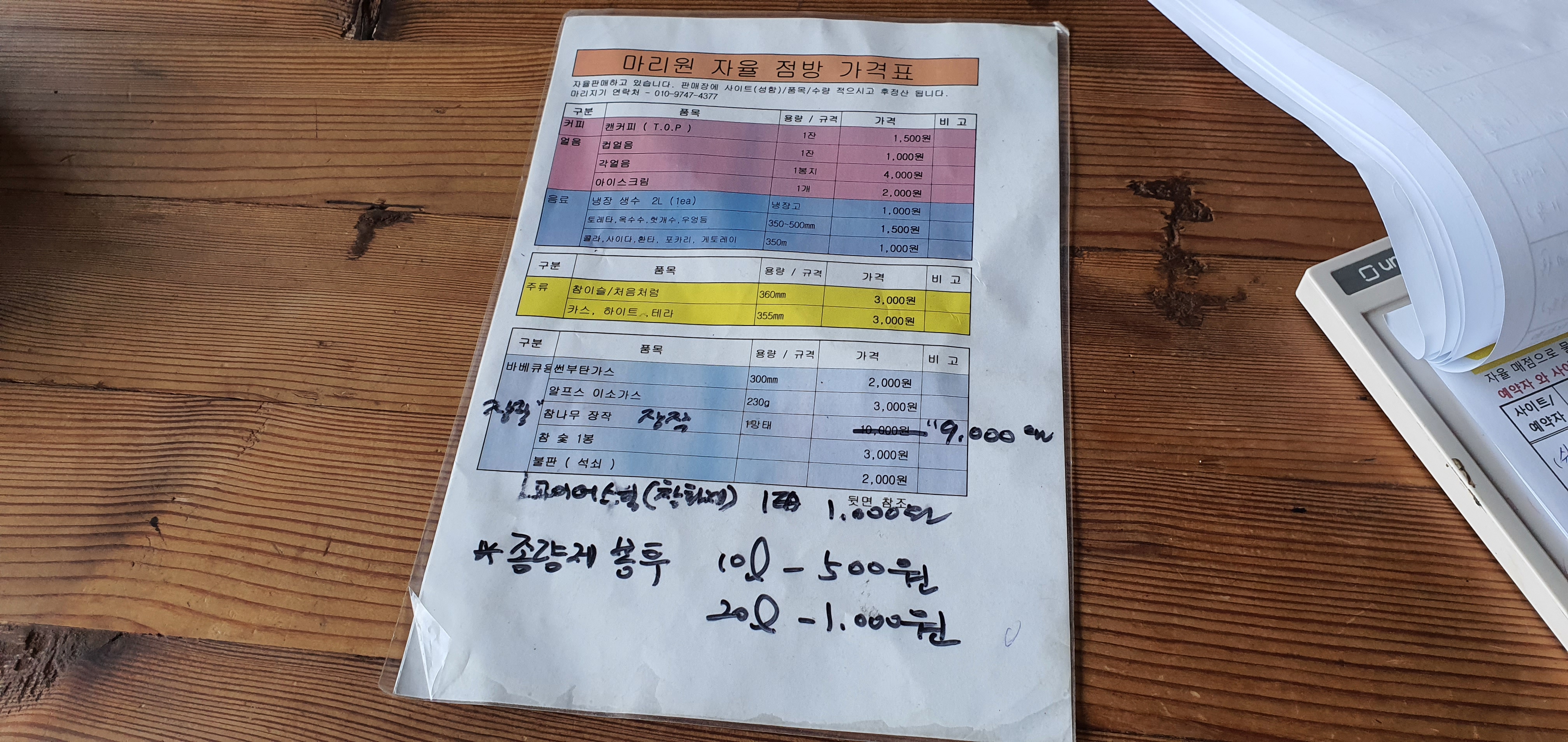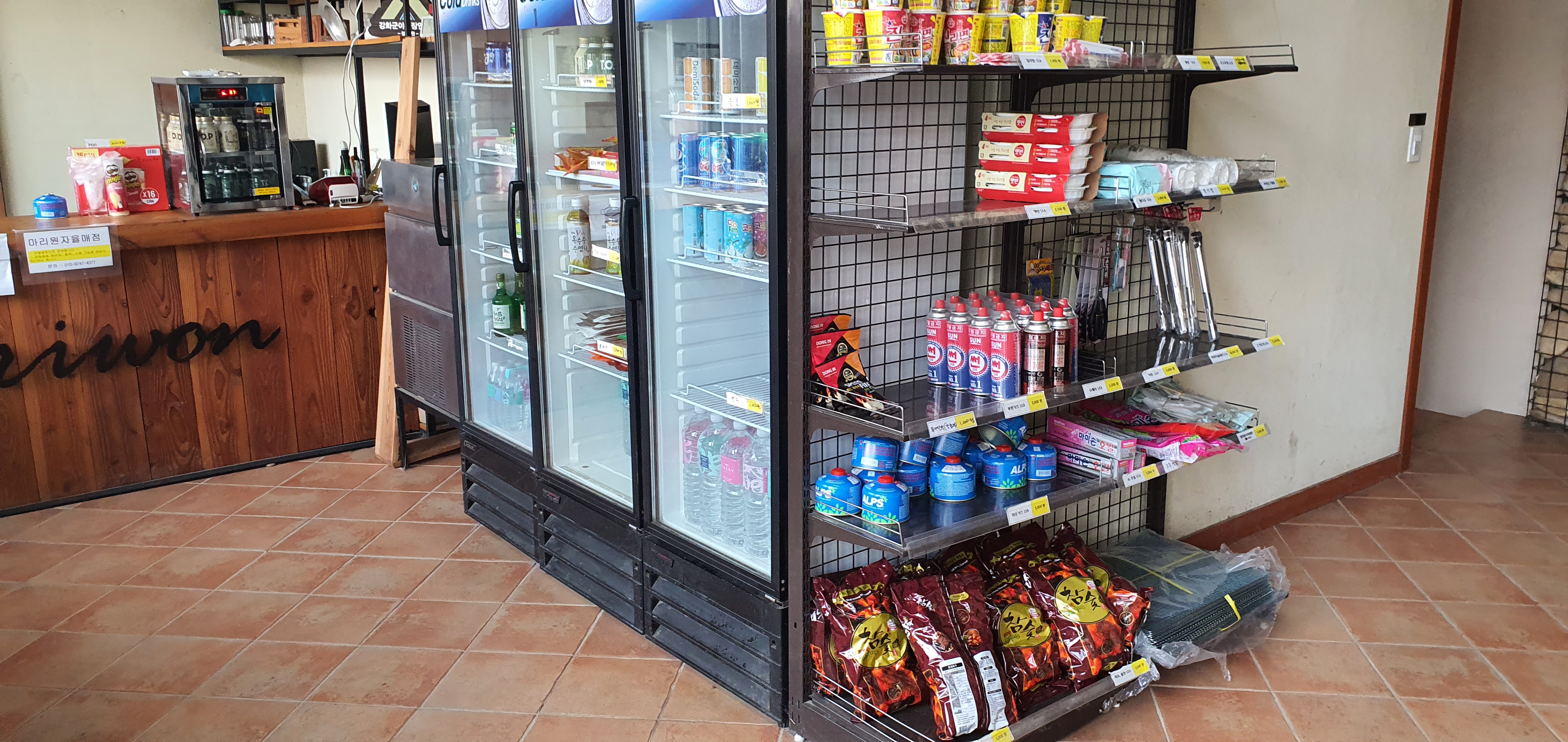 강화캠핑장 마리원 자율매점에서는 다양하고 많은 물품을 판매하는 것은 아니지만 캠핑에 필요한 물품만을 진열해 놓고 자율 판매를 하고 있습니다. 다른 여타의 캠핑장에서는 매점 운영을 통해서 크게 수익을 내는 경우가 많은데 마리원 매점은 캠핑 관리에 집중하시고 매점은 방문객들이 불편하지 않을 정도만을 운영하고 있는 느낌이 듭니다.