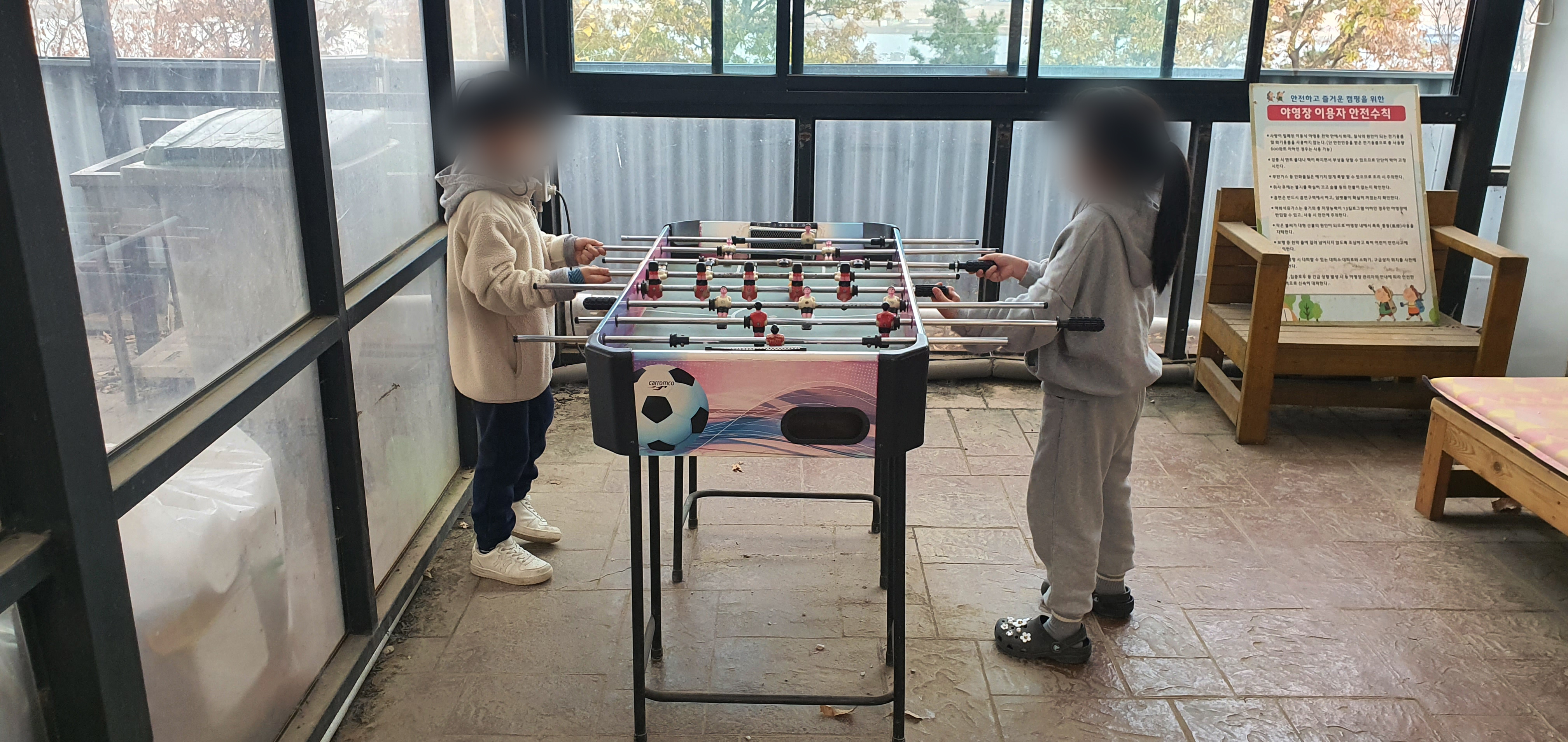 개수대 안에는 테이블 축구게임이 있습니다. 그래서 설겆이를 하는 엄마를 따라서 왔다가 테이블 축구게임에 빠지는 아이들을 종종 볼 수 있습니다. 우리 아이들도 재미있고 숲 7번 사이트에세 가까워서 인지 하루에도 열댓번은 왔다갔다하면서 게임을 했습니다.
