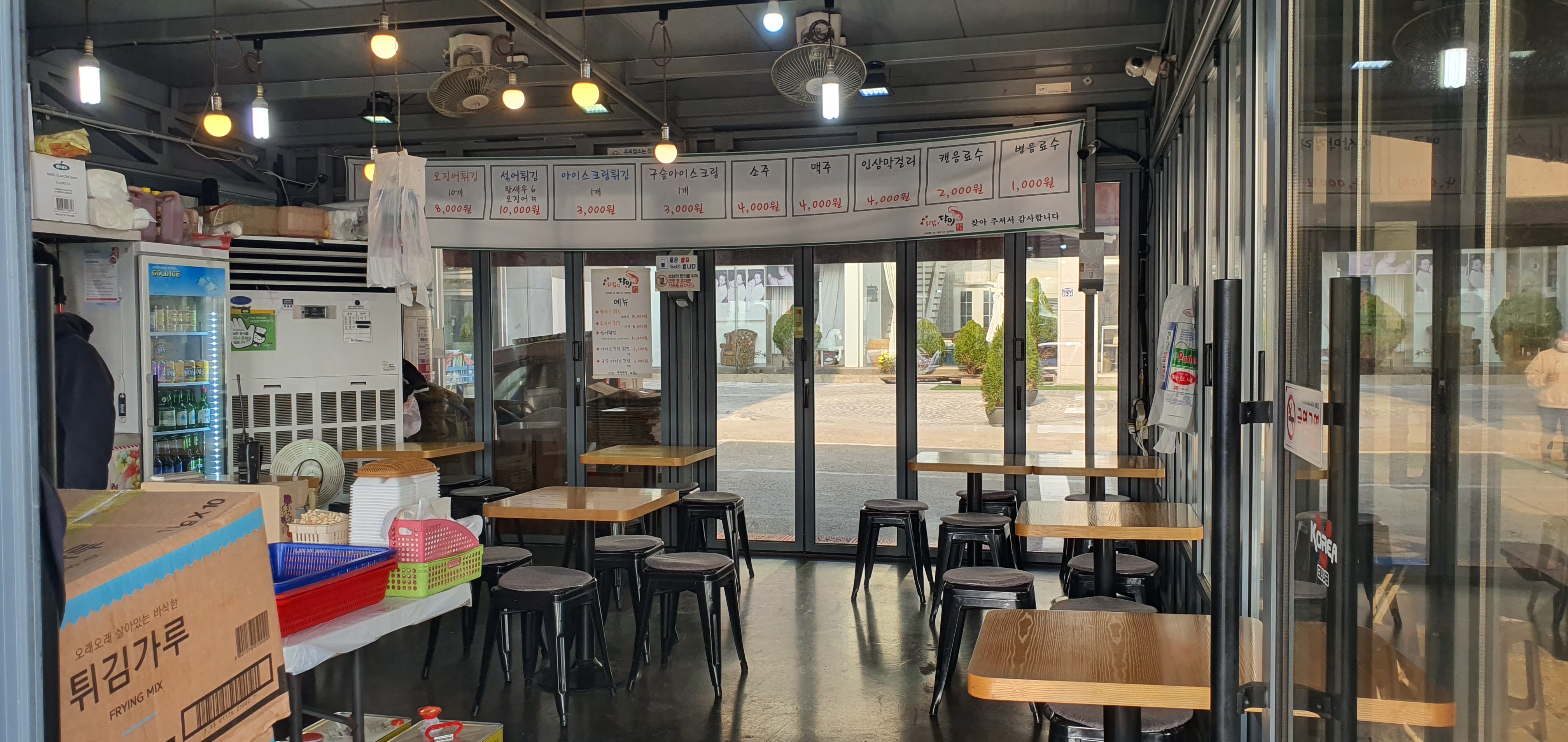 단순히 튀김집이지만 실내 테이블도 있어 튀김과 함께 술과 음료를 즐길 수 있습니다. 튀김이라는 특성상 간단하게 먹고 자리를 떠나는 경우가 많아서 그런지 김포맛집 튀김의 달인 테이블도 작고 의자도 등받이가 없는 체어도 되어 있습니다.
