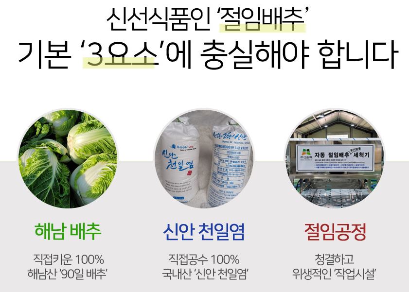 해남 절임배추20kg의 특징은 크게 3가지입니다. 청정바다와 50미터 인접한 거리에 위치한 곳에서 자란 해남산 90일 배추로 자연해풍을 맞으며 자라 미네랄이 풍부하고 자연 소독되는 효과도 있어 병충해에 강한 것이 해남배추의 첫 번째 특징입니다. 절임배추20kg로 절임에 사용하는 소금이 정말 중요한데 배추를 절이는데 가장 좋은 청정 섬 지역에서 채취한 100퍼센트 국내산으로 갯벌에서 생산해 미네랄과 천연성분을 그대로 함유하고 있어 단맛이 나는 신안 천일염을 사용했습니다.
