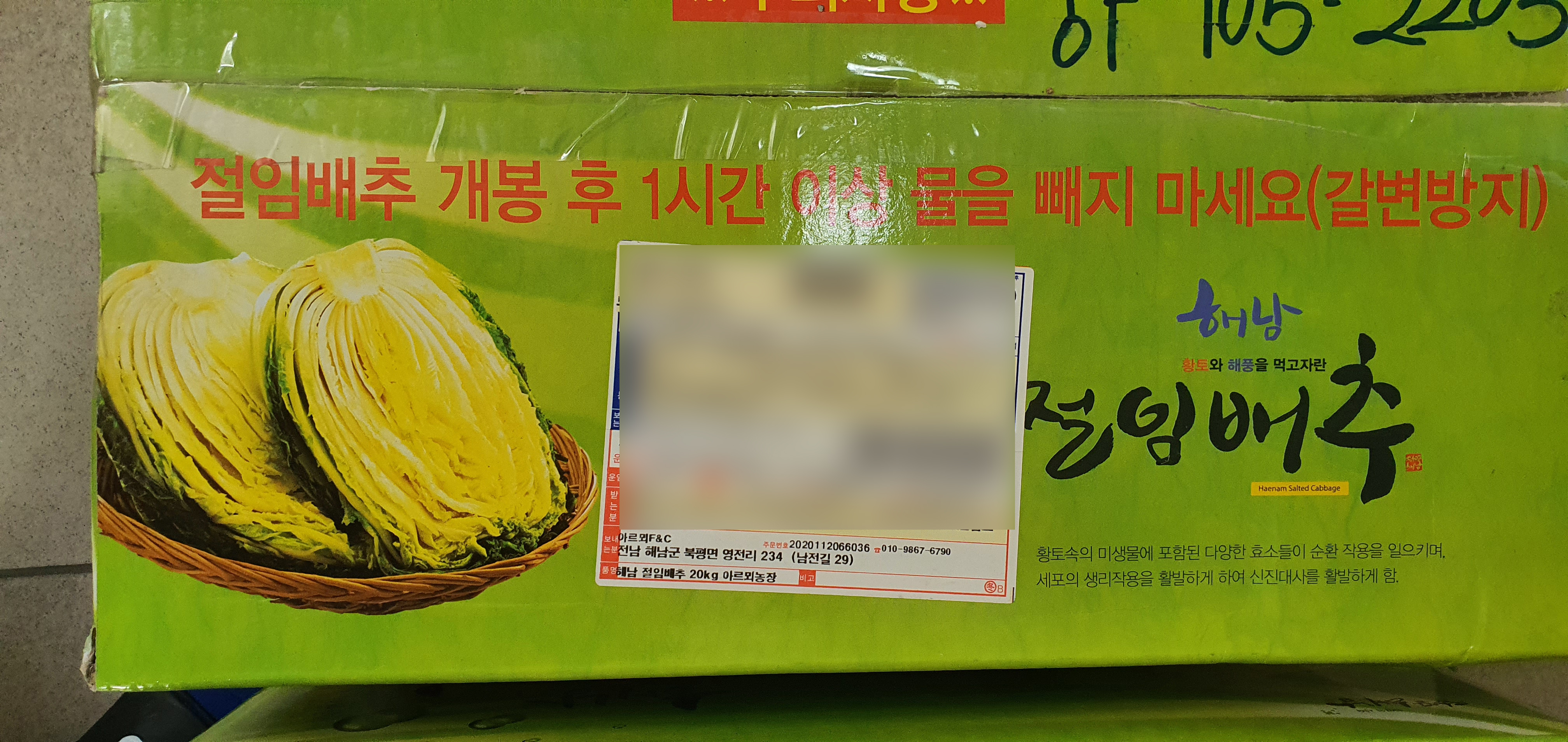 김장 전날 도착한 해남 절임배추20kg입니다. 홈페이지 안내와 같이 도착시간은 맞출 수는 없지만 도착일에는 무조건 배달됩니다. 택배 박스에 가장 중요한 절임배추 개봉 후 1시간 이상 물을 빼지 말라는 주의사항이 적색으로 안내되어 있습니다. 갈변 방지를 하기 위함이니 철저히 지켜주셔야겠습니다.
