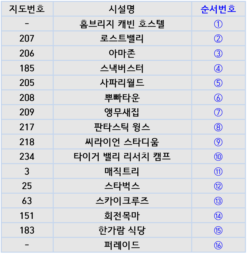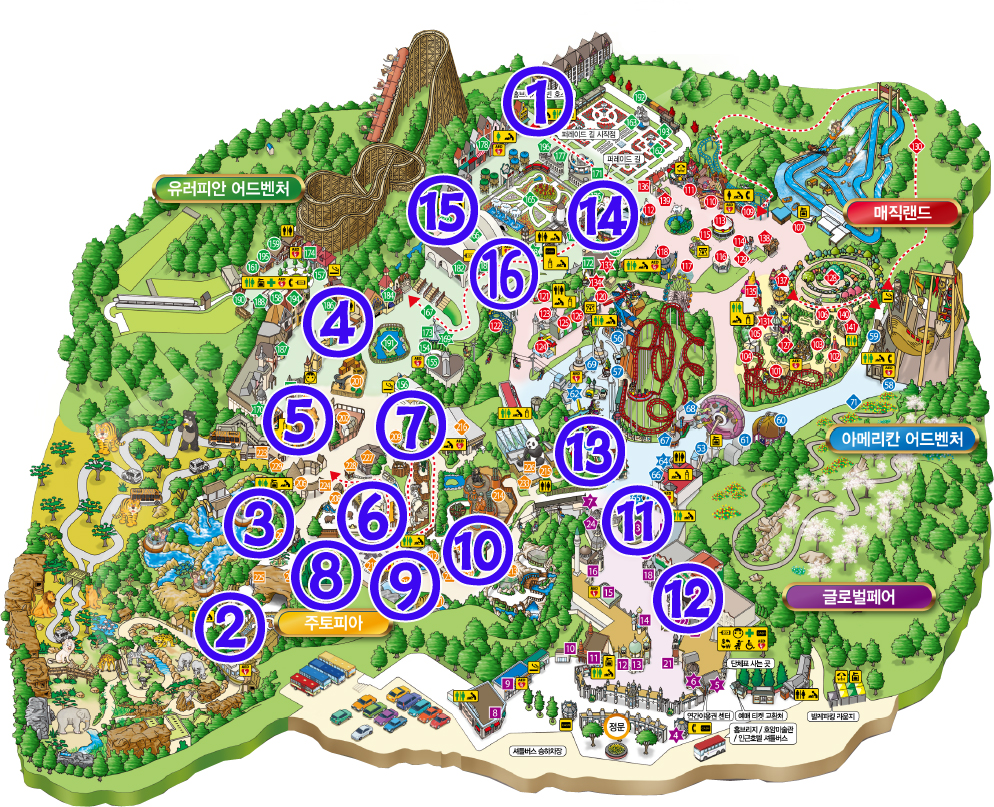 위 그림의 배경 지도는 에버랜드 홈페이지에 제공하는 그림을 편집한 것으로 청색 원번호는 1일차 이용한 코스를 순서대로 표시하였습니다.
