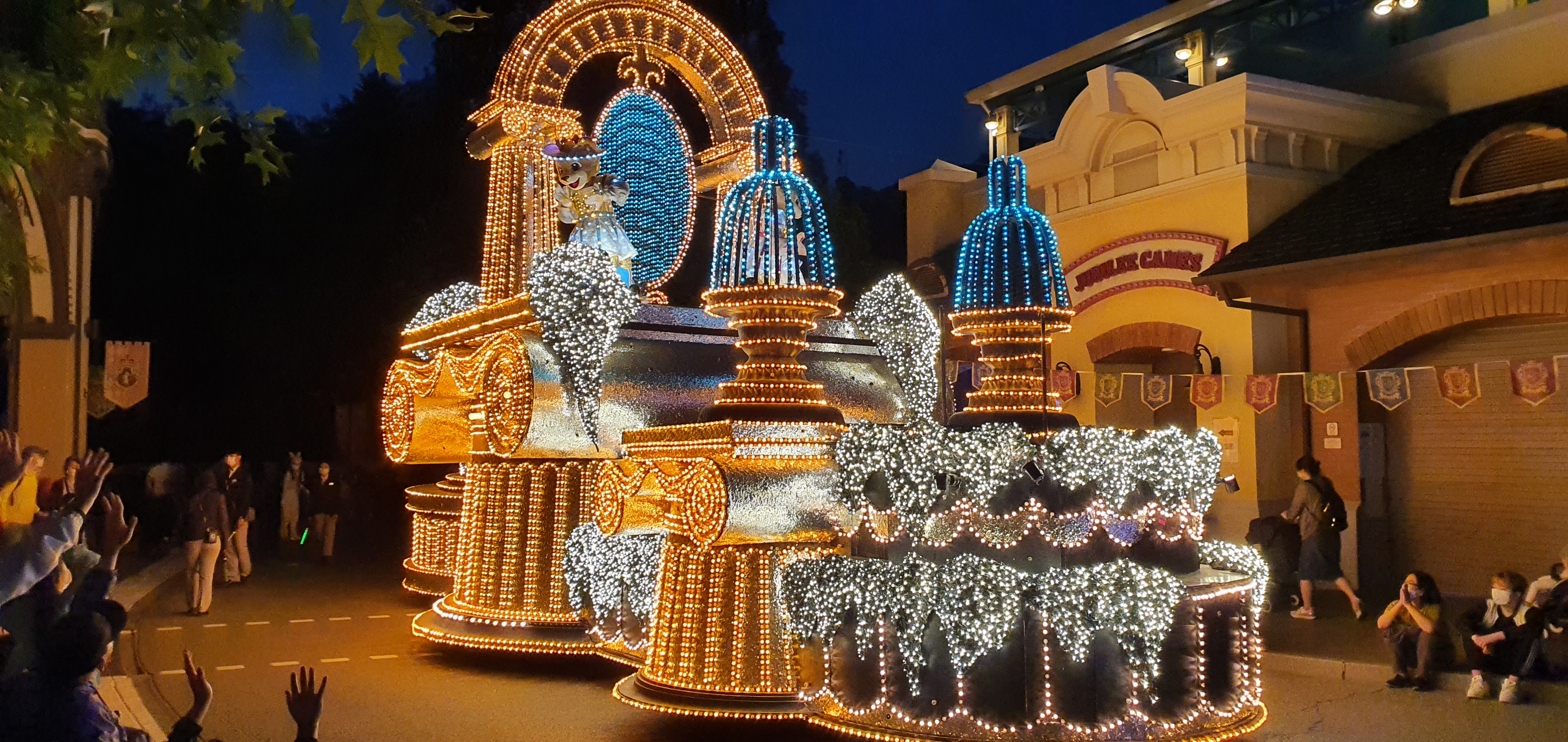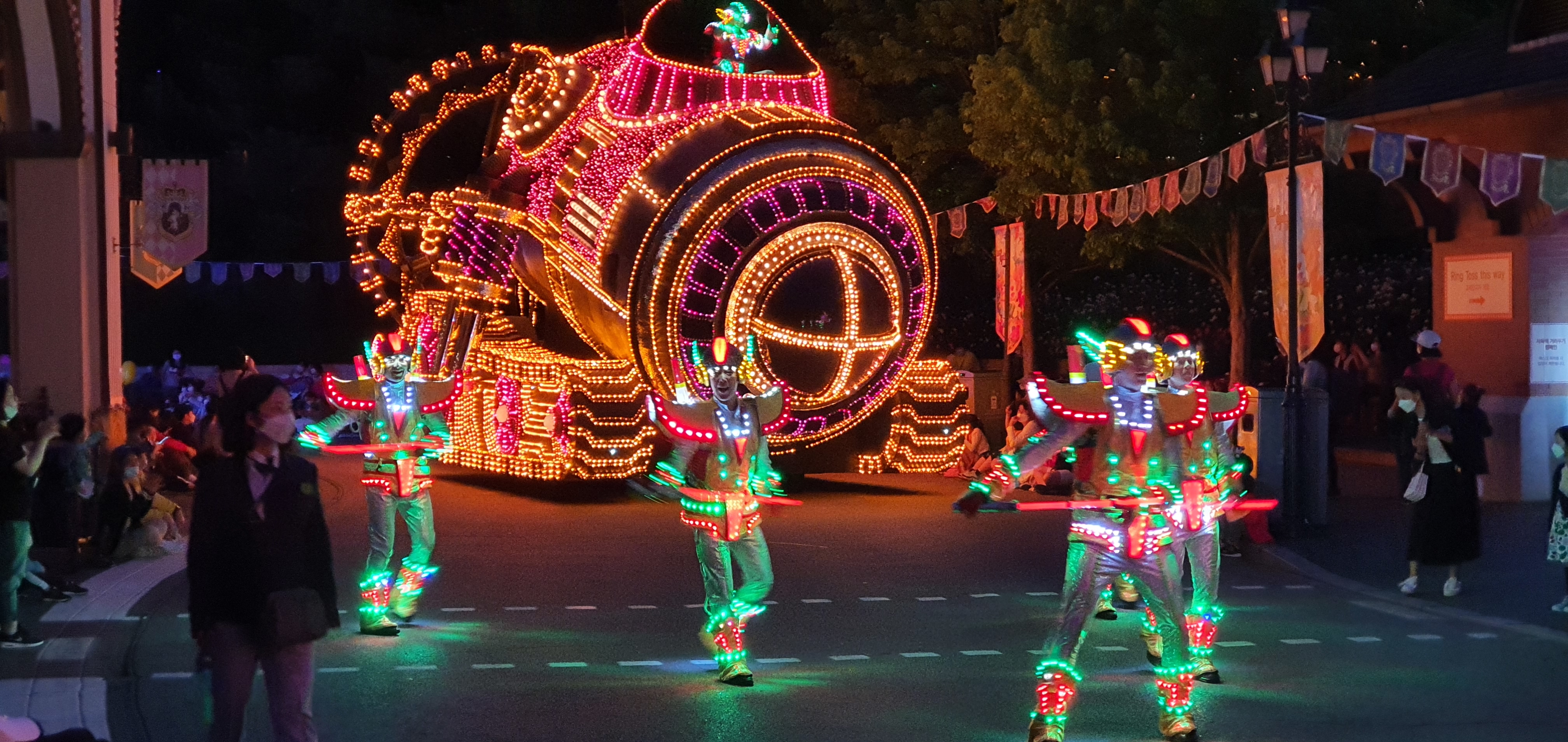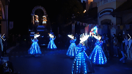 야간 퍼레이드 주제는 문라이트 퍼레이드로 움직이는 관람차의 화려함도 있지만 퍼레이드 무용수들이 착용한 네온 의상이 정말 눈부십니다. 그리고 무용수 분들이 키가 큰 서양인들이 대부분이서 그런지 동작이 시원해서 좋습니다.