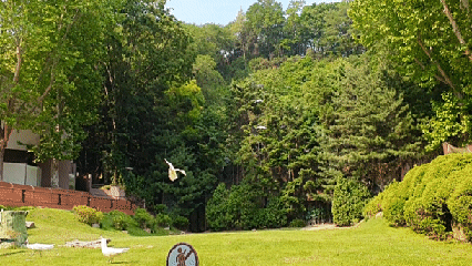 앵무새집은 제한된 공간에서 움직이는 새들을 관람하는 것이라면 판타스틱윙스는 넓은 실외 공간에서 큰 새들이 나는 모습을 볼 수 있는 공연입니다. 무슨 새인줄은 모르겠는데 공작새 같은 하얀 새가 언덕에서 날아서 넓은 잔디에 착지하는 모습이 정말 아름답습니다.