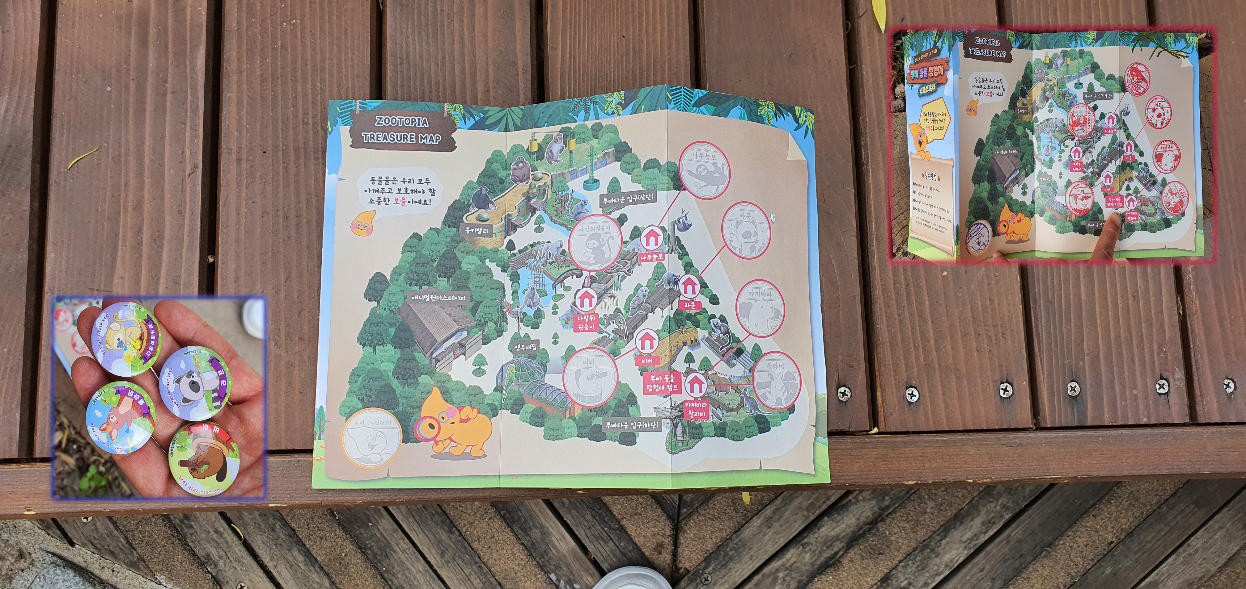 뿌빠타운 입구에는 위 사진과 같이 뿌빠타운을 소개하는 지도가 제공됩니다. 지도를 보면 뿌빠타운 동물들이 위치한 곳을 가리키는 곳에 원형 안에 해당 동물 그림이 그려져 있는데 우측 상단 편집 사진과 같이 해당 장소에서 그림과 동일한 스탬프를 찍을 수 있습니다. 모든 동물이 있는 곳에서 동물 관람을 하고 스탬프를 모두다 찍어서 입구에 안내원 분들에게 제출하면 위 사진 좌측 하단의 편집 사진과 같은 뿌빠타운 동물 그림이 그려져 있는 벳지가 제공됩니다. 아이들은 벳지를 받기 위해서 뿌빠타운 구석구석을 다 다니는데 아이들은 벳지를 받기 위한 동기부여가 솟아올라 보호자 분들은 잠시나마 입구에서 휴식을 취할 수 있는 시간을 가질 수 있습니다.