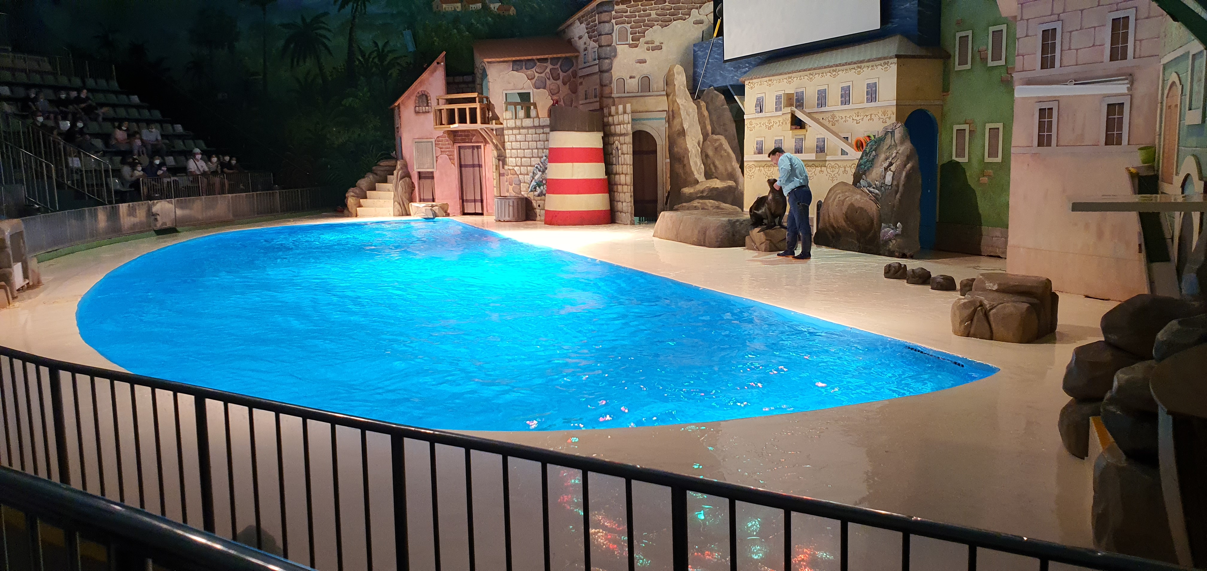 위 사진과 같이 공연장에는 물개가 잠영 및 수영하는 모습을 관람할 수 있게 커다란 수영장이있습니다. 출연하시는 분들과 여러 마리의 물개들이 나오는데 연습이 많이 되어서 그런지 신기할 정도로 손발이 잘 맞습니다. 물개들이 지능이 정말 높은 것을 알 수 있습니다.