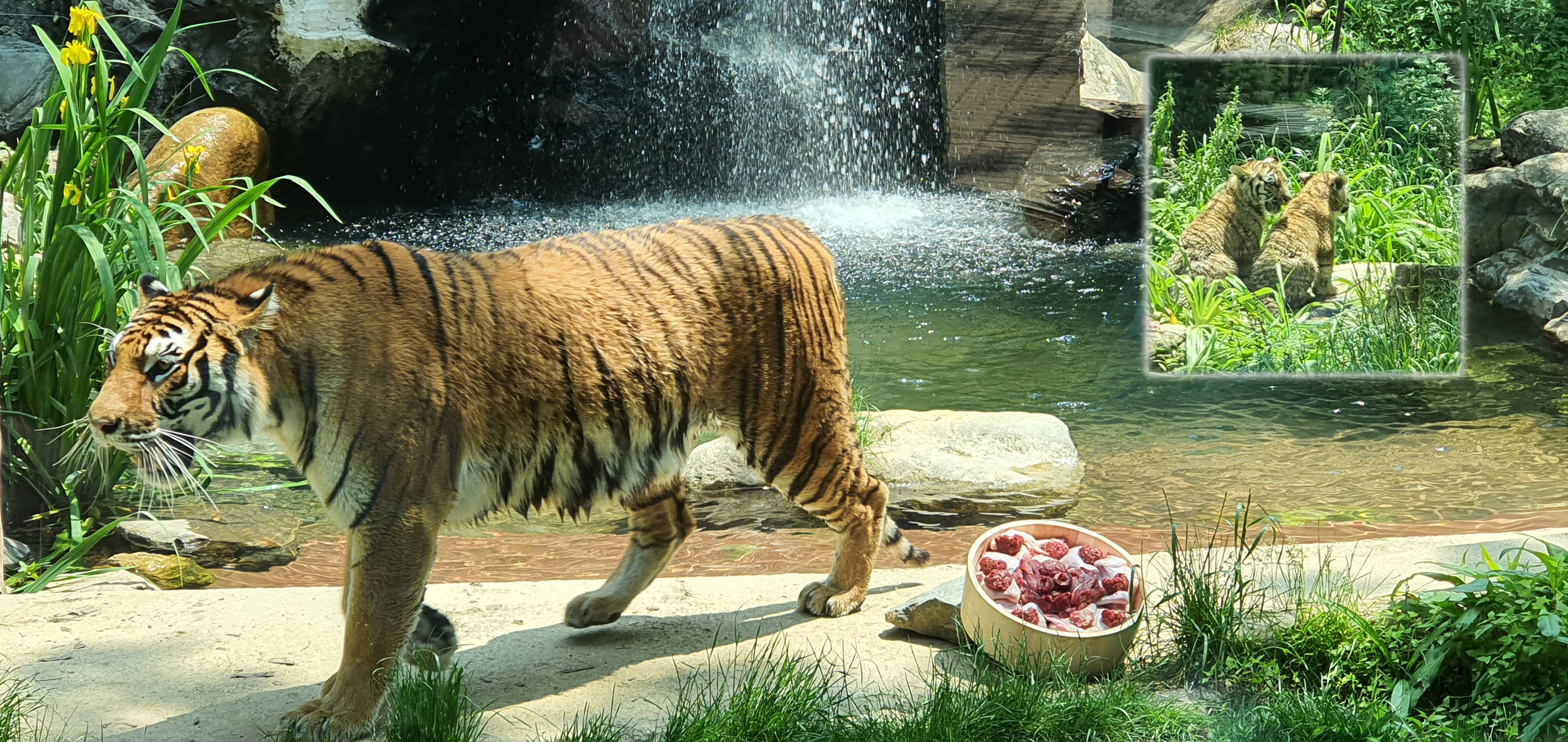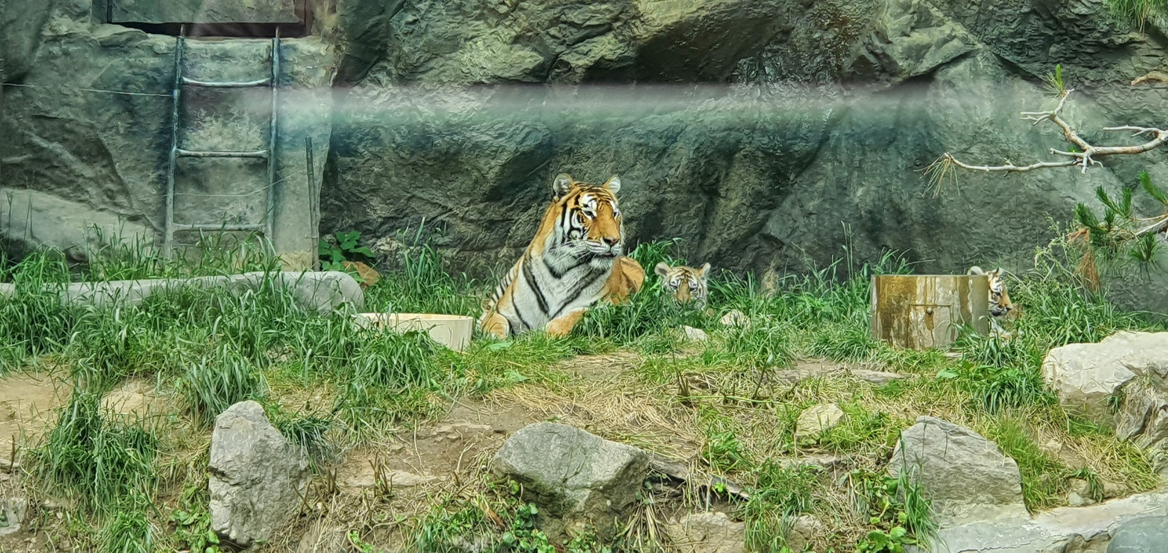 위 사진은 둘째날 촬영한 사진인데 운 좋게도 먹이를 주는 시간에 관람을 하게 되었습니다. 관람객들이 많았음에도 호랑이도 배고픔은 어떻게 할 수가 없나 봅니다. 관람객 가까이에 먹을 것이 있으니 가까이 안올 수가 없고 새끼 호랑이들이 지키기 위한 어미 호랑이의 경계하는 모습을 관람할 수 있었습니다. 두꺼운 유리를 두고 바로 앞에서 관람을 하는 것으로 정말 호랑이가 이렇게 큰 동물인지 실감할 수 있습니다.