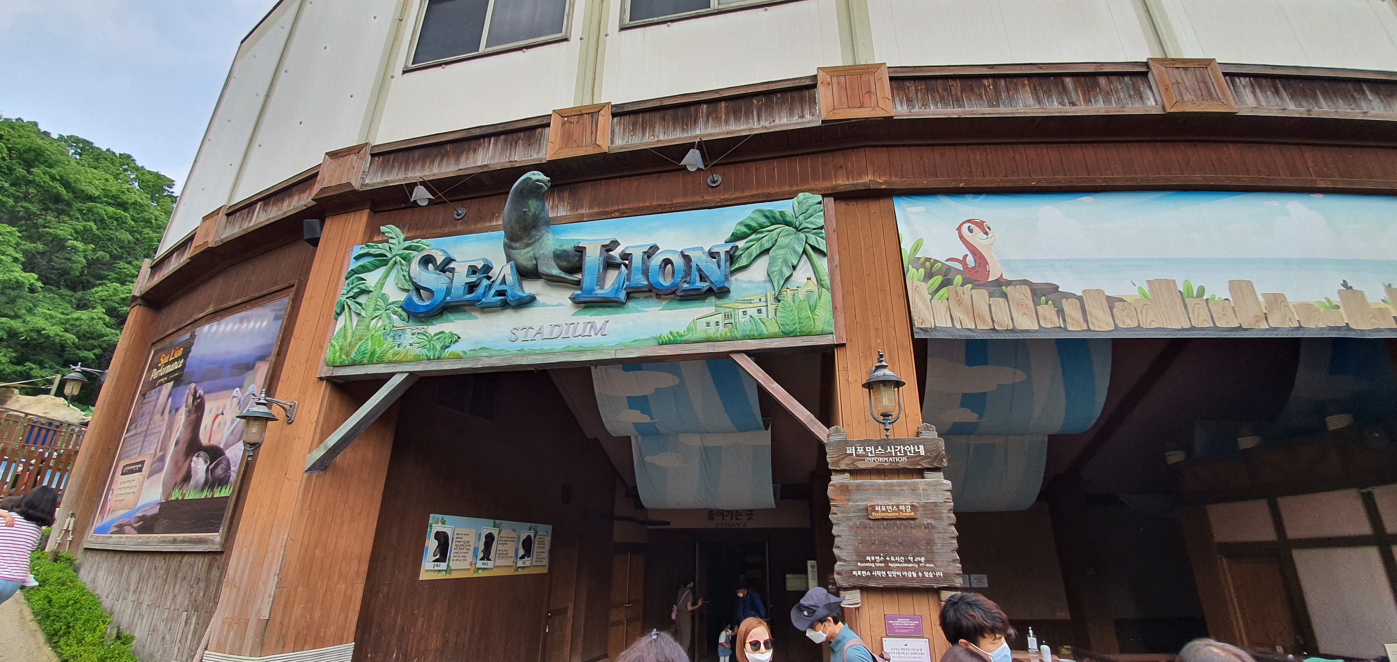 에버랜트 추천코스 일곱번째 시설은 씨라이언 스타디움입니다. 공연 장소 이름은 '씨라이언'이여서 바다사자가 출연할 줄 알았는데 물개가 주인공입니다. 줄거리가 있는 공연으로 물개를 지키기 위한 물개박사와 토토의 물개섬 이야기입니다. 이리저리 돌아다니는 공연으로 지친 다리를 잠시나마 앉아서 볼 수 있는 공연입니다.
