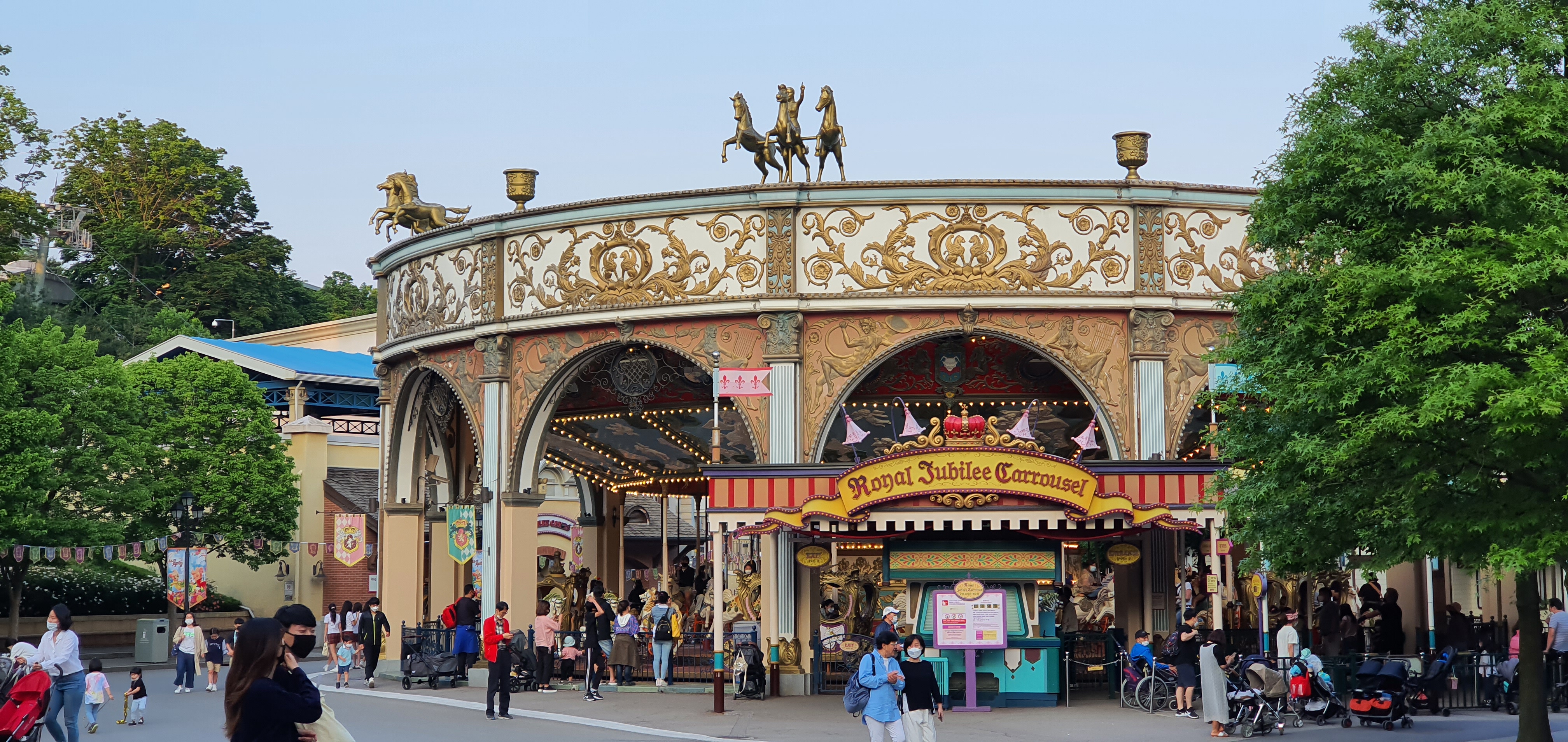 퍼레이드전에 식사를 하기에는 조금 이른 시간이라 놀이동산에서 빠질 수 없는 회전목마를 이용했습니다. 해가 지기 전이라 화려함은 조금 덜하지만 완전히 어두워지면 화려한 조명과 함께 정말 멋집니다.