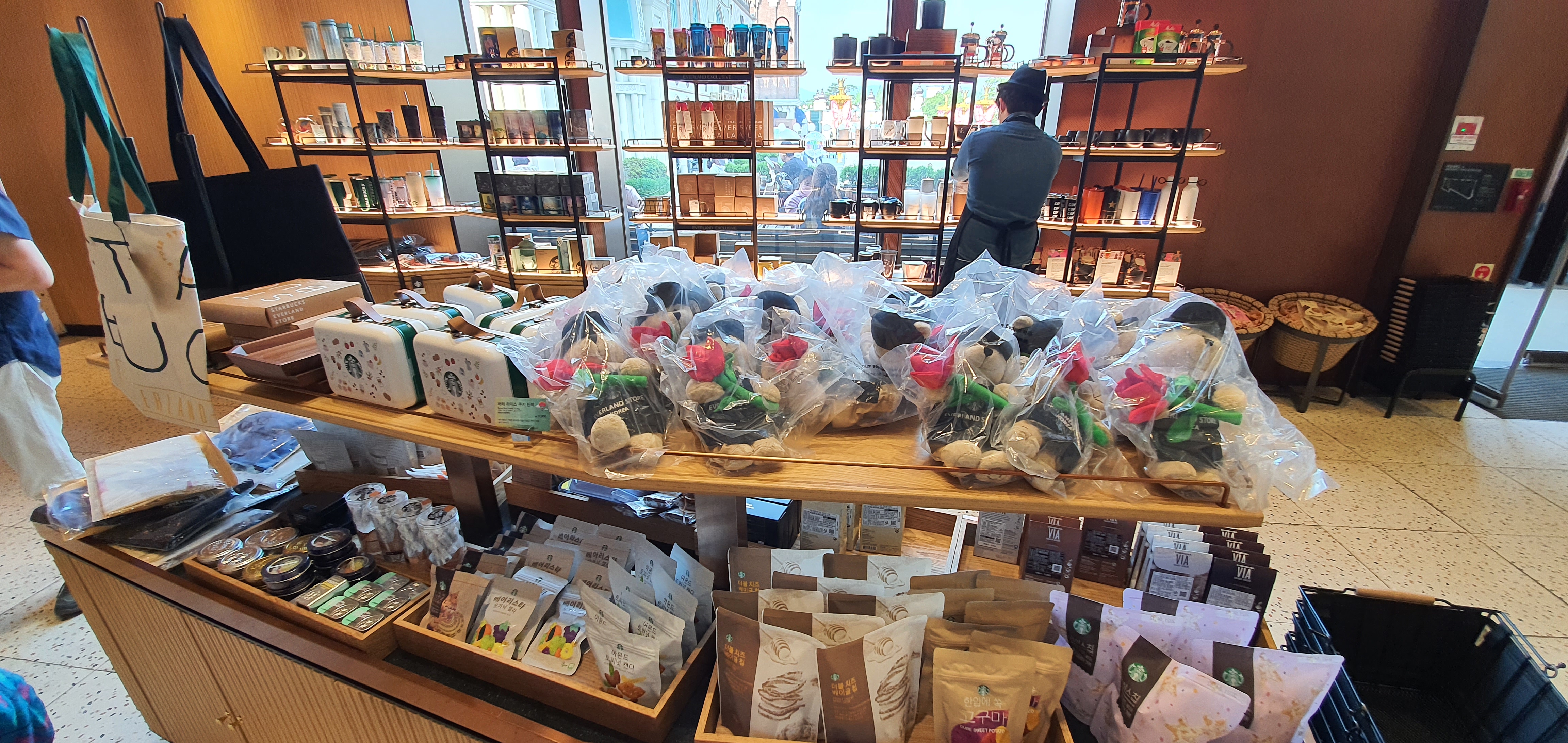 에버랜드내에 위치한 스타벅스여서 그런지 매장내 판매대 비치된 물품들도 일반 매장에서는 볼 수 없는 것들이 많았습니다. 인형, 가방 그리고 사진 뒤에 텀블러나 컵 등도 종류가 정말 다양했습니다.