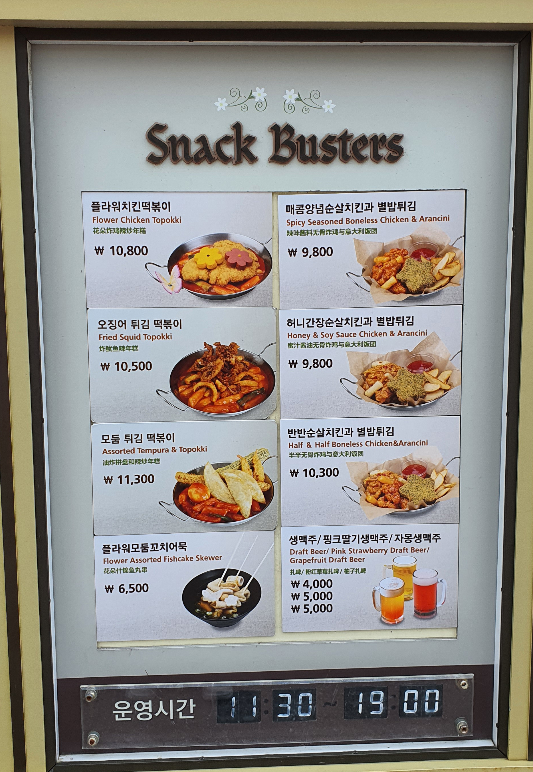 스낵버스터에서 이용한 메뉴는 허니간장순살치킨과 별밥튀김, 모둠 튀김 떡볶이, 플라워모둠꼬치어묵 등 3가지입니다. 배불리 먹는 것보다 놀이시설마다 팝콘, 추러스, 아이스크림 등 다양한 먹을 것들을 이용할 예정이라서 허기만 채울 수 있게 간단하게 주문하였습니다.