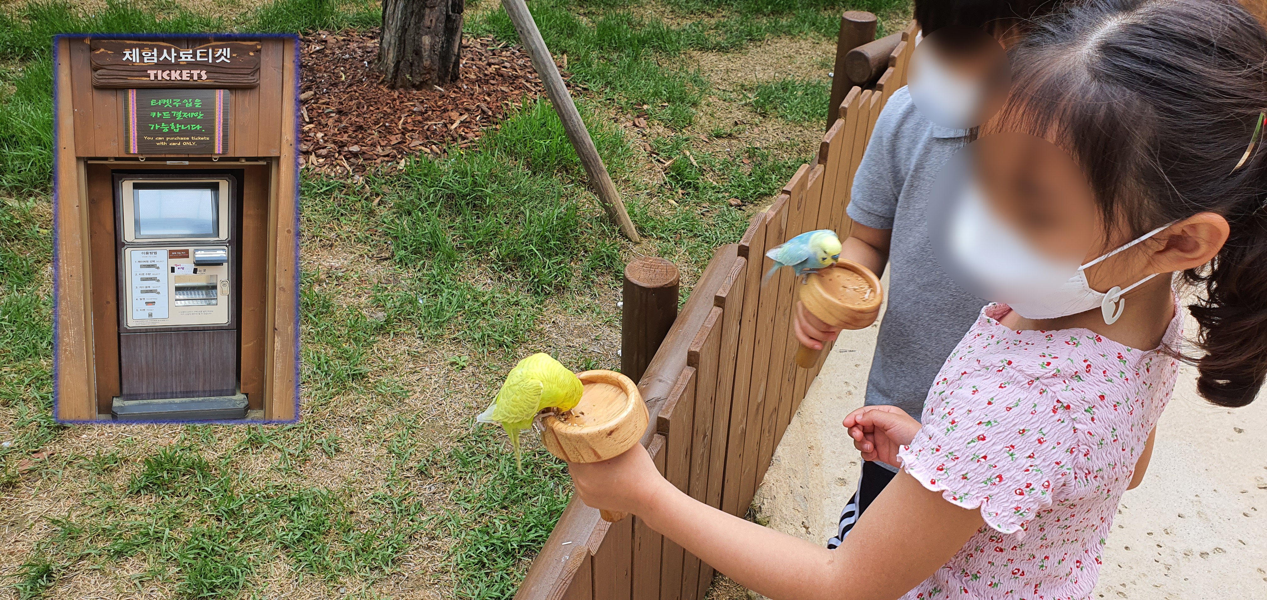 에버랜드코스추천 앵무새집은 새들에게 먹이를 줄 수 있는 체험을 할 수 있습니다. 위 사진 좌측 상단에 편집 사진처럼 체험사료티켓을 구매하여 직원에게 제출하면 손잡이가 달린 먹이 통과 사료를 줍니다. 새들이 훈련이 되어 있어서 그런지 사료를 통에 담아서 들고 있으면 먹이를 먹을려고 새들이 모입니다. 아이들이 작은 새들이 모여서 먹이를 먹는 모습을 보면서 즐거워도하고 신기해 합니다.