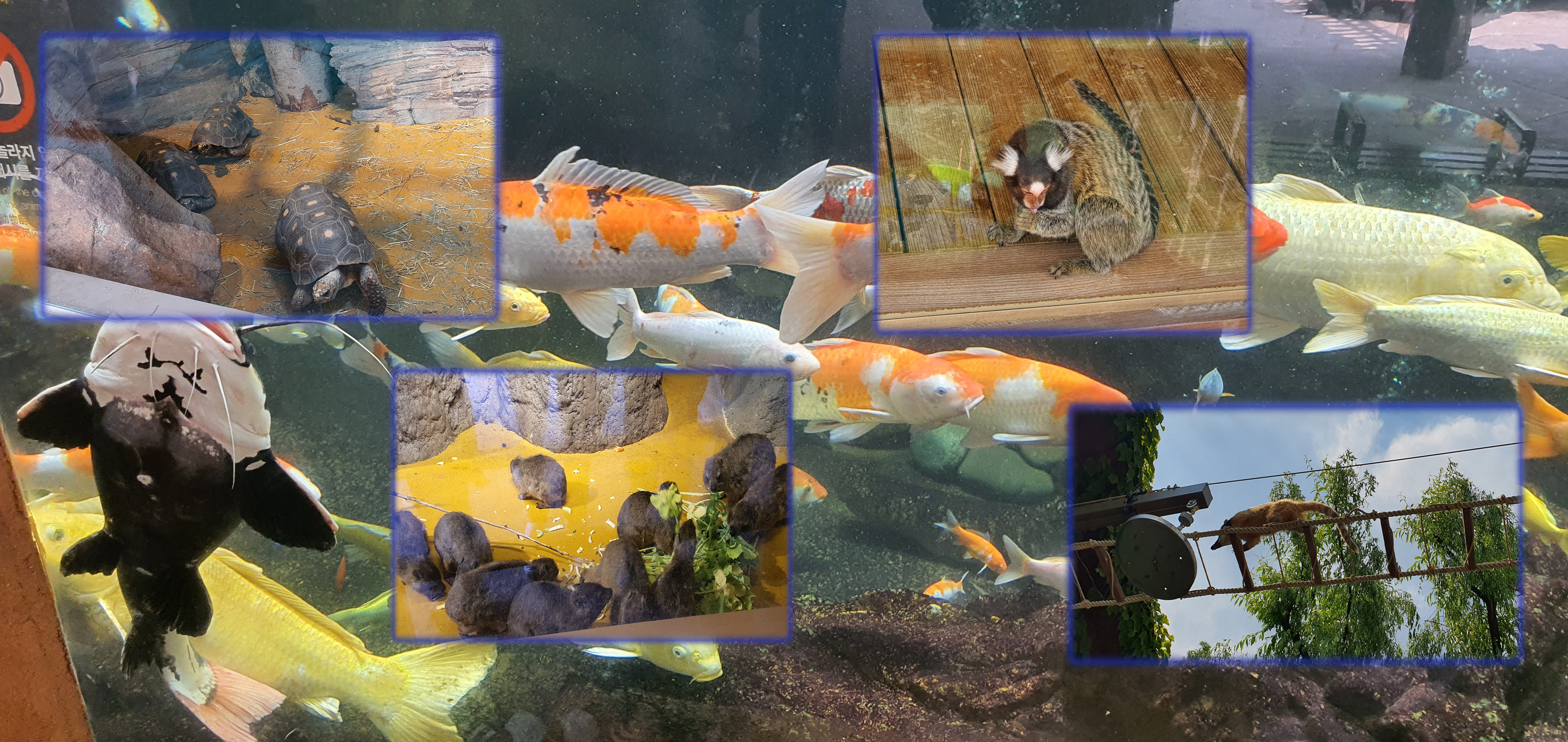 뿌빠타운에는 스탬프를 찍을 수 있는 동물들 외에서 성인 팔뚝만한 비단잉어, 거북이, 라쿤, 마모셋원숭이 등 작고 귀여운 동물들을 가까이에서 서 관람이 가능합니다. 특히 라쿤 같은 경우에는 우측 하단 편집 사진과 같이 집과 집사이에 설치되어 있는 다리를 건너는 모습을 볼 수 있습니다.