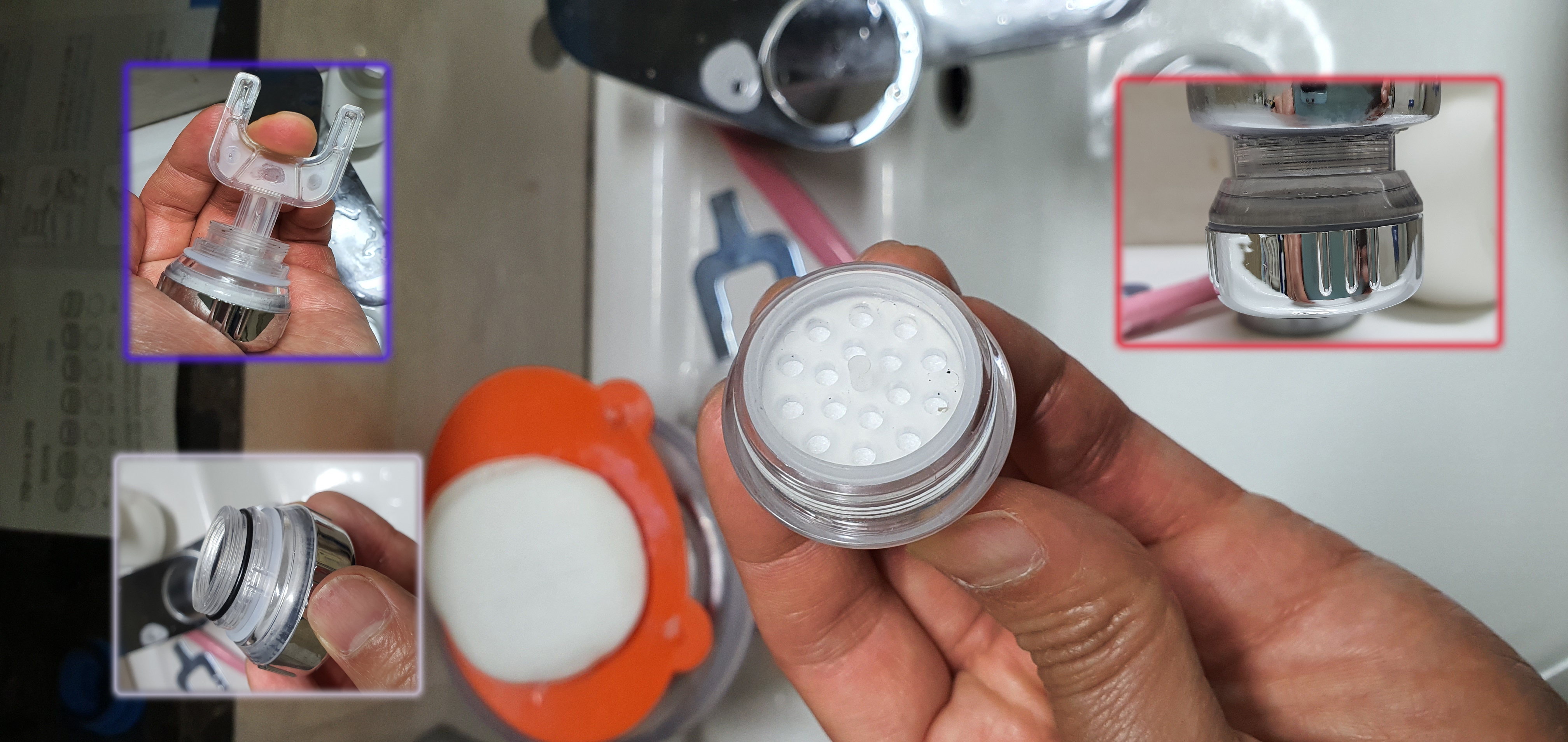 세면대 필터 부분이 결합 전에는 하얗습니다. 세면대 결합 부분과 맞는 연결부위를 선택하고 함께 제공된 플라스틱 스패너 손잡이 부분을 이용하여 본품과 결합합니다. 그리고 우리 집 세면대의 경우 좌측 하단 편집 사진과 같이 투명 고무링과 검정 고무링을 결합했습니다. 그리고 우측 편집 사진과 같이 세면대에 단단히 결합하면 끝입니다.