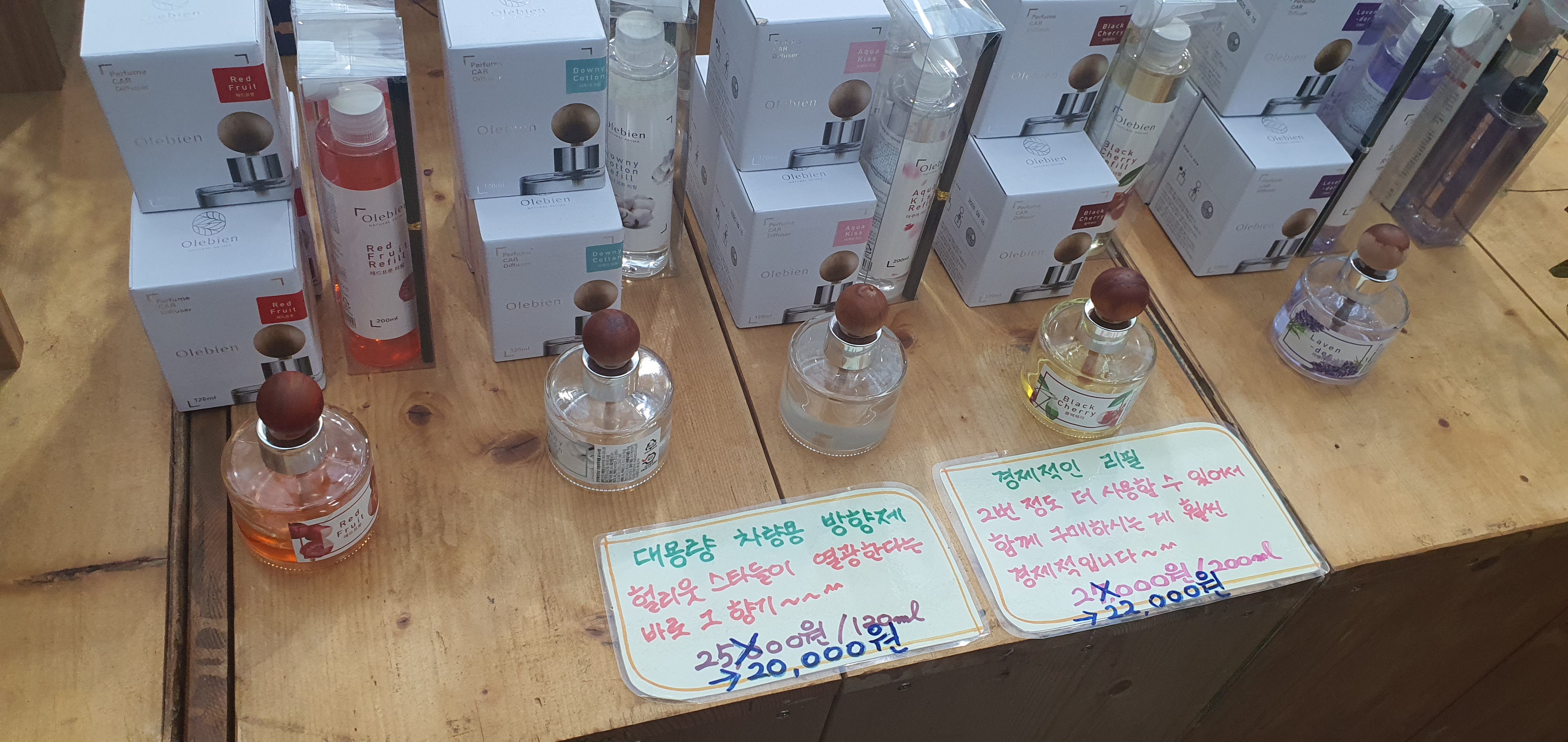 특히 방향제 제품들이 많이 있었습니다. 제품마다 향기를 맡아보고 개인 취향에 맞는 제품을 선택하여 구매가 가능하게끔 개봉된 테스트 제품이 종류별로 놓여져 있었습니다. 그리고 경제적인 대용량 제품에 대한 프로모션을 하고 있어 차량에서 좋지않은 냄새가 베어 있거나 차량내 흡연으로 향기로 잡내를 없에기 위해서 구매를 하시는 것도 훌륭한 선택일 것 같습니다.