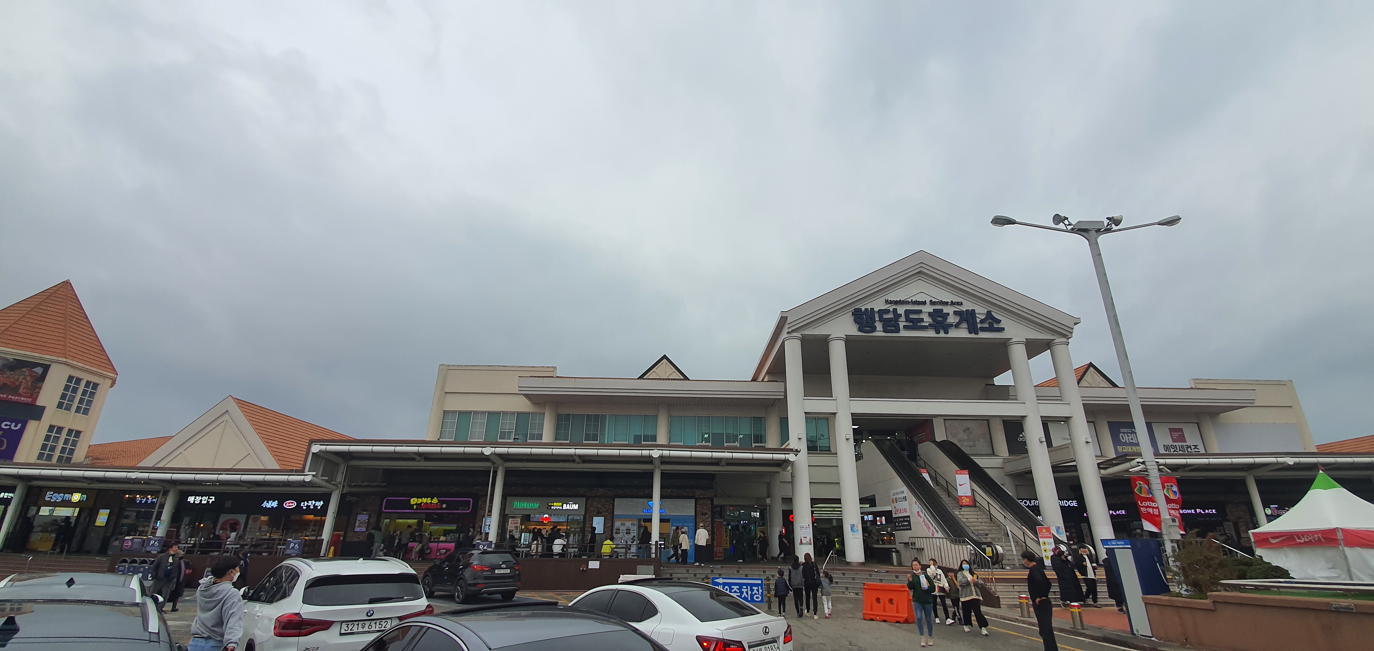 제가 방문하였을 때가 구름이 잔뜩 끼어있는 날씨였습니다. 앞 사진에서 보셨듯이 정말 휴게소인데 쇼핑몰처럼 지어졌습니다. 멀리서는 잘 보이지 않았는데 행담도휴게소라는 높은 곳에 간판이 있는 건물 중앙부분에는 2층으로 올라가는 에스컬레이터가 보입니다. 고속도로 휴게소에 에스컬레이터가 있는 것은 처음 봅니다.