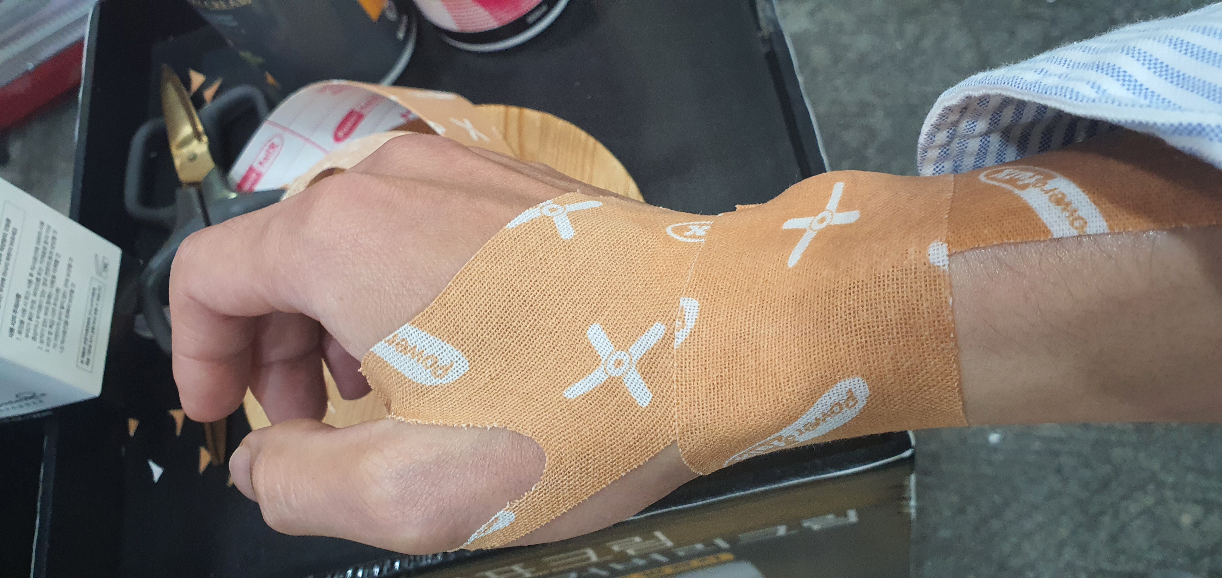 사실 고속도로 휴게소마다 있는 박찬호크림인데 서해안고속도로 행담도휴게소는 그냥 대충 테이핑하지 않았습니다. 아주 전문적으로 팔목 통증있는 부위를 얘기하니 그곳에 맞춤식으로 테이프를 요리조리 자르더니 위 사진과 같이 테이핑해 주셨습니다.