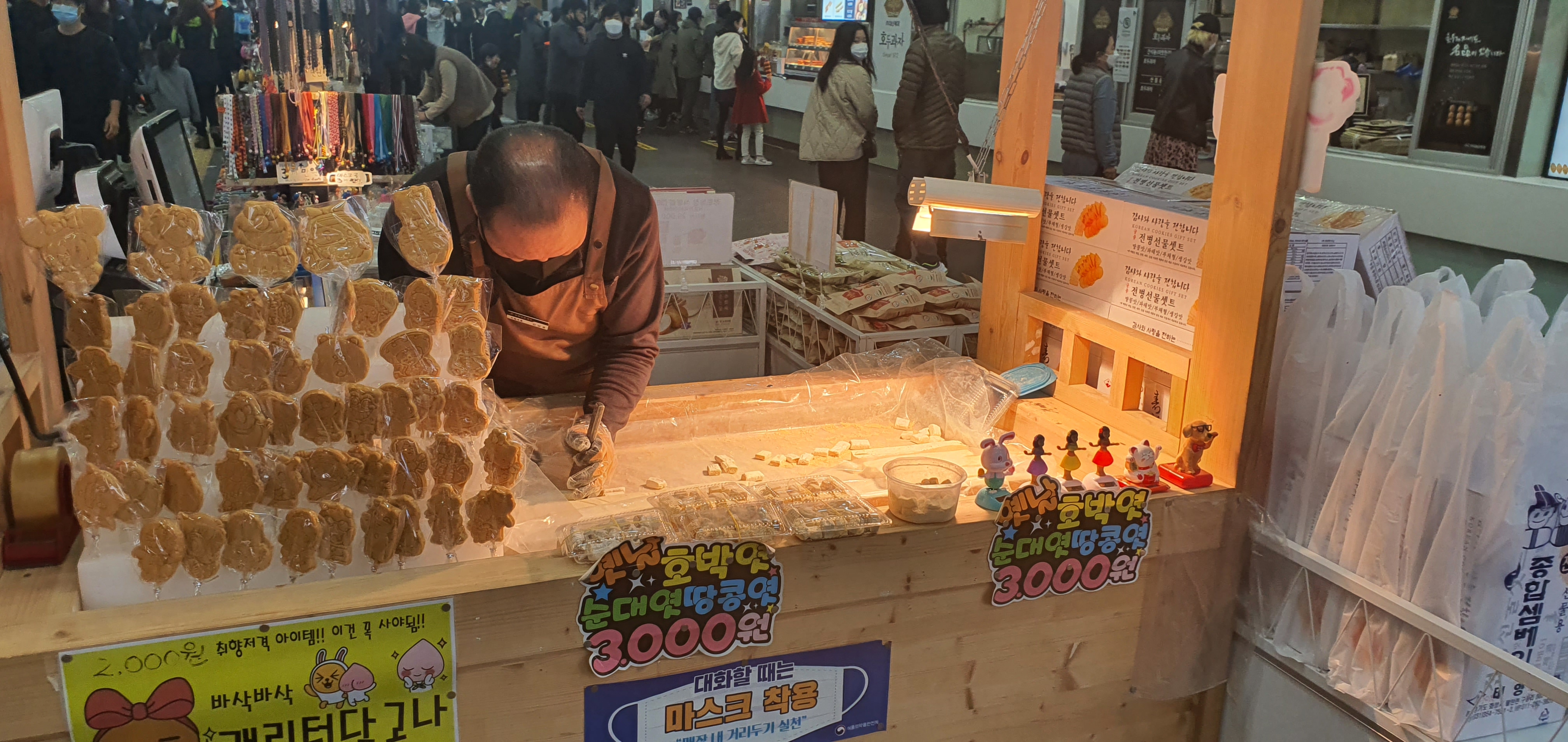 서해안고속도로 행담도휴게소 화장실 가는 길에 위치한 노점 중에 노오란 호박엿을 판매하는 곳도 있었습니다. 호박엿 사장님께서 엿을 한입에 쏙 들어 갈 수 있게 심열을 기울여 자르는 모습이 인상 깊어서 촬영해 보았습니다. 사진 좌측에 보시면 다양한 캐릭터 모양의 달고나도 판매하고 있었습니다.