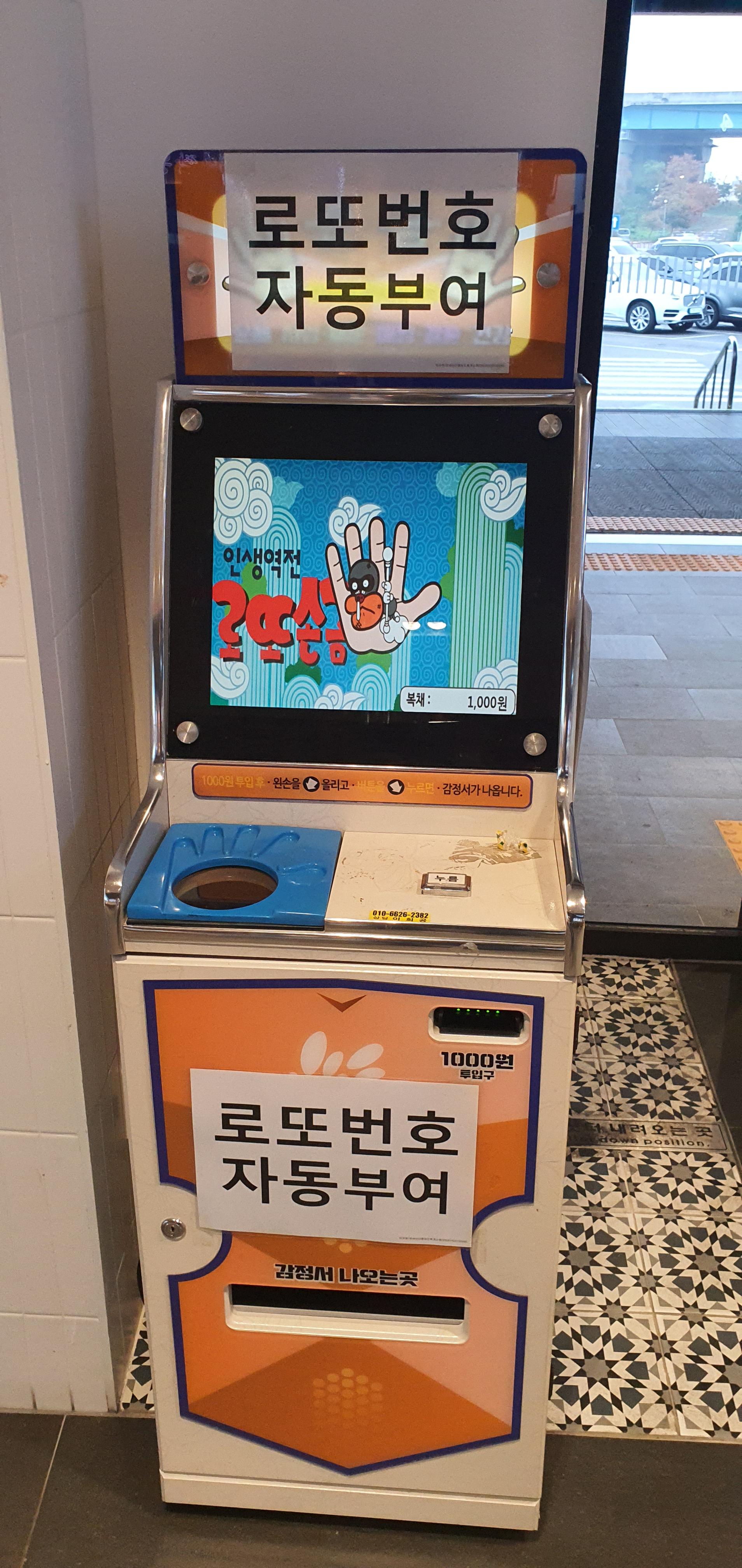 로또 판매점 가까운 곳에는 로또번호 자동부여하는 기계가 있습니다. 이것은 특이하게 개인의 손금을 읽어서 번호를 부여하는 방식인데 로또 좋아하시는 좀 더 투자하는샘 치고 재미삼아 해보시는 것도 괜찮을 것 같습니다. 하여튼 로또만 판매로 끝나는 것이 아닌 연관성있게 손님의 주머니에서 돈이 나오도록 잘 갖췄습니다.