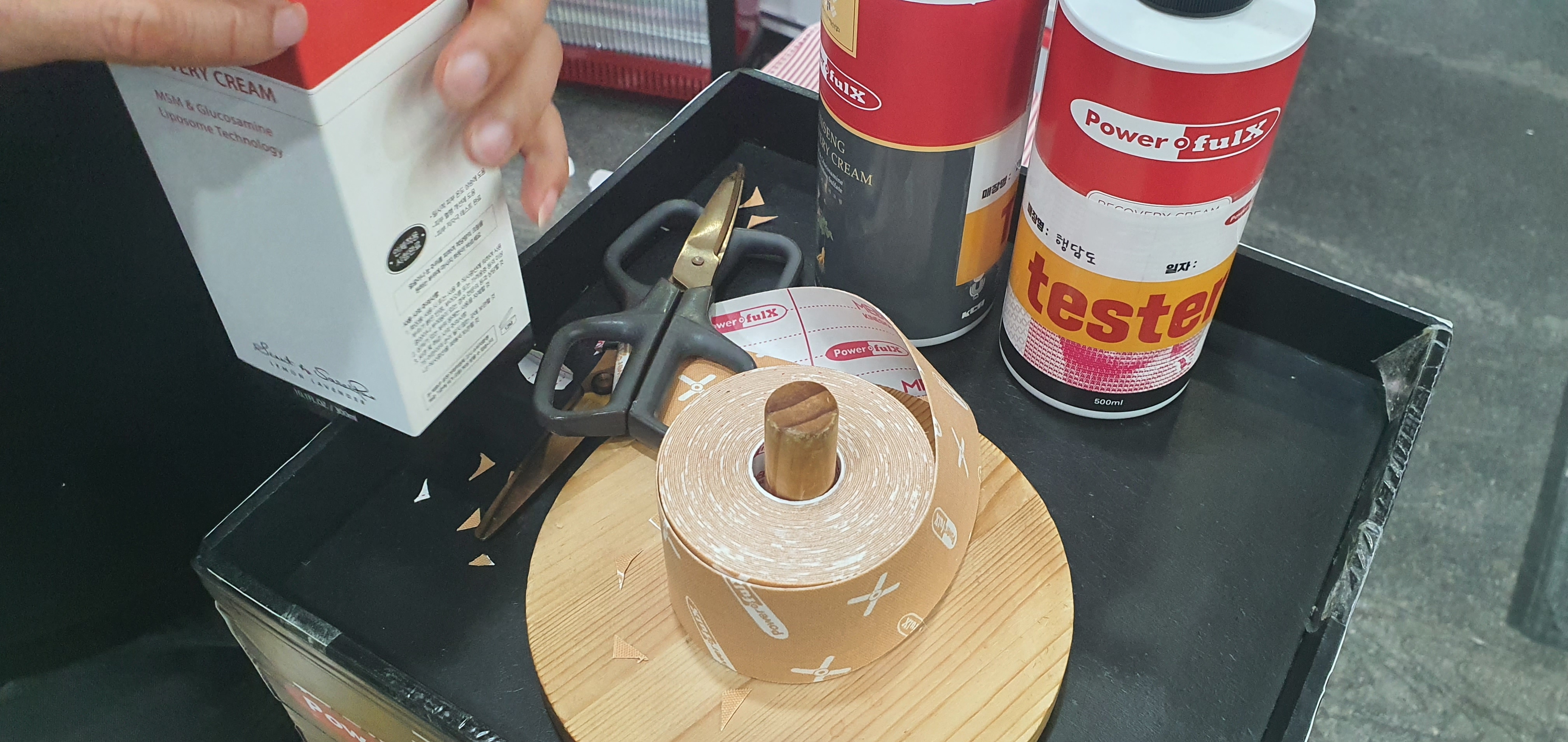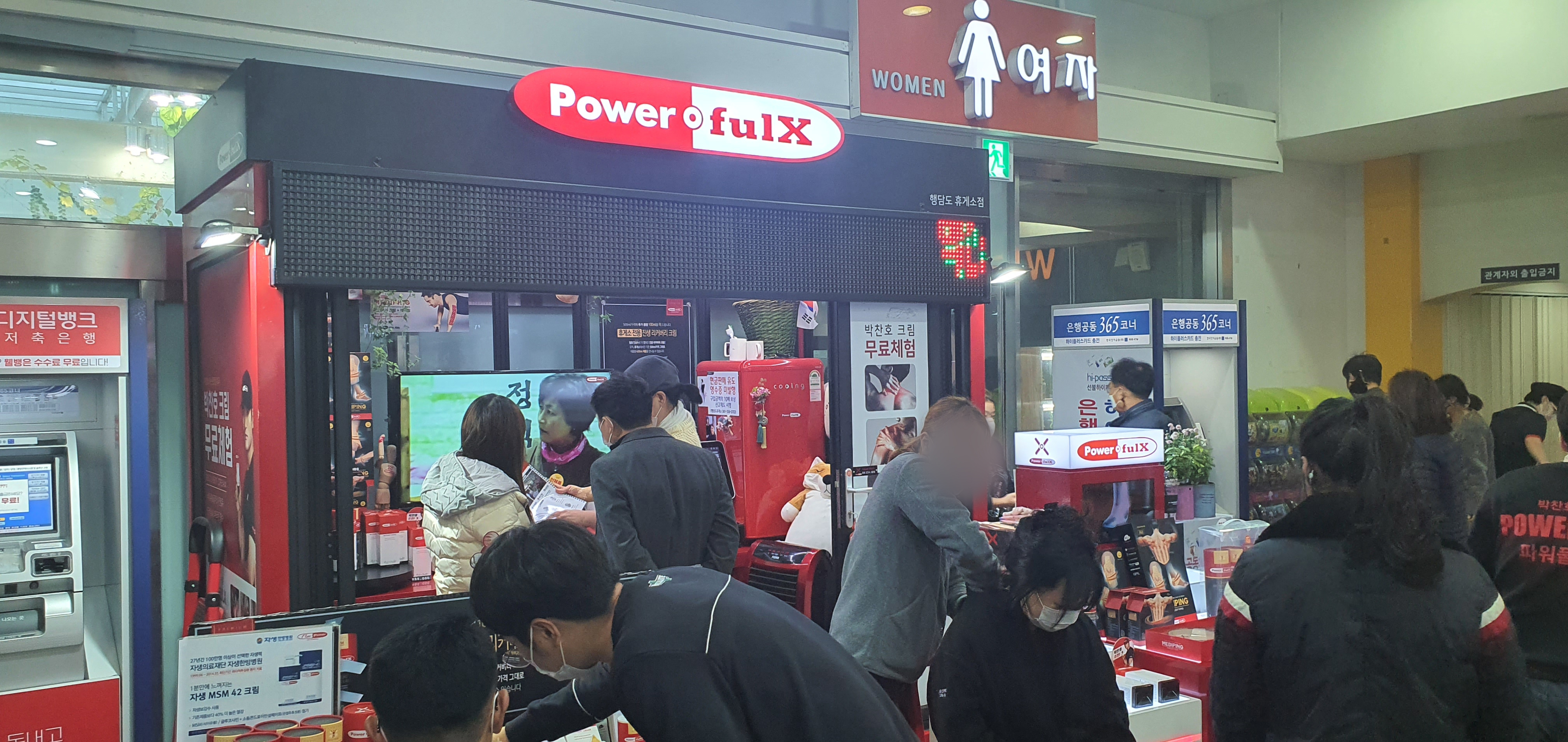 화장실가는 자리잡고 있는 파워풀엑스입니다. 일명 박찬호크림이라고 합니다. 일단 저기를 방문하면 판매하시는 분들이 사정없이 붙이고 발라 줍니다. 저도 구경삼아 가서 팔목이 안좋다고 하니 사정없이 붙여주셨습니다.