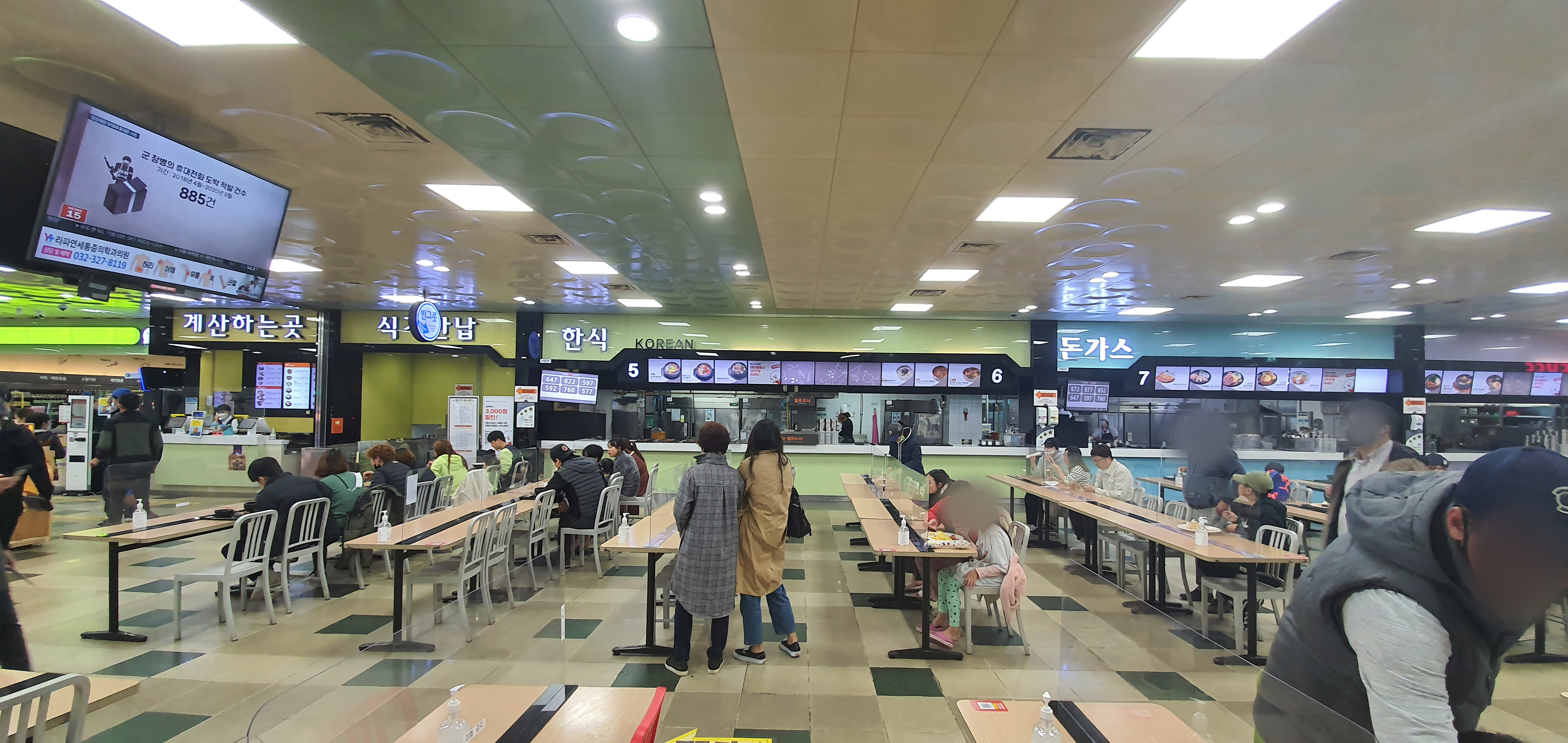 실내 음식도 깨끗하게 자리 배치되어 있습니다. 한쪽에는 계산하는 곳이 있고 한식, 돈가스 등 개인이 원하는 음식 종류를 선택 및 주문하여 즐기실 수 있습니다.