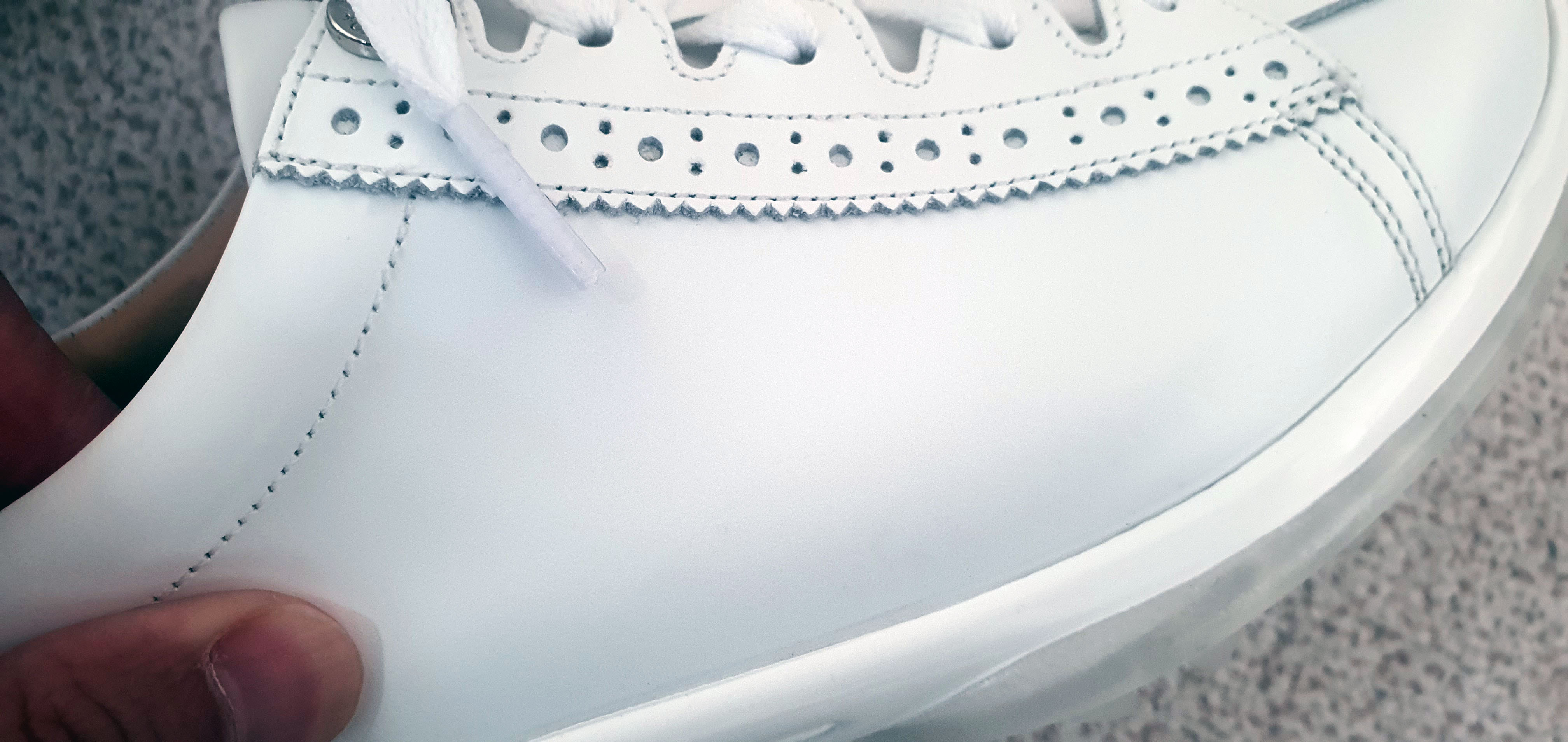 매장에서도 착용해보니 소가죽의 단단함이 느껴지지만 운동화처럼 편안하게 착용이 되었습니다. 남성골프화도 그렇지만 여성골프화는 발이 정말 편안해야 하는데 착용전에 예상보다 그러한 점에서 굉장히 만족스러웠고 특히 착용해보니 클래식한 것보다 캐주얼하다는 느낌이 많이 들어서 좋았습니다. 디자인 부분 특징은 슈레이스 부분에서 이어져 내려와서 뱀프 부분을 덮어주는 가죽 장식이 여성스러움을 더해줍니다.