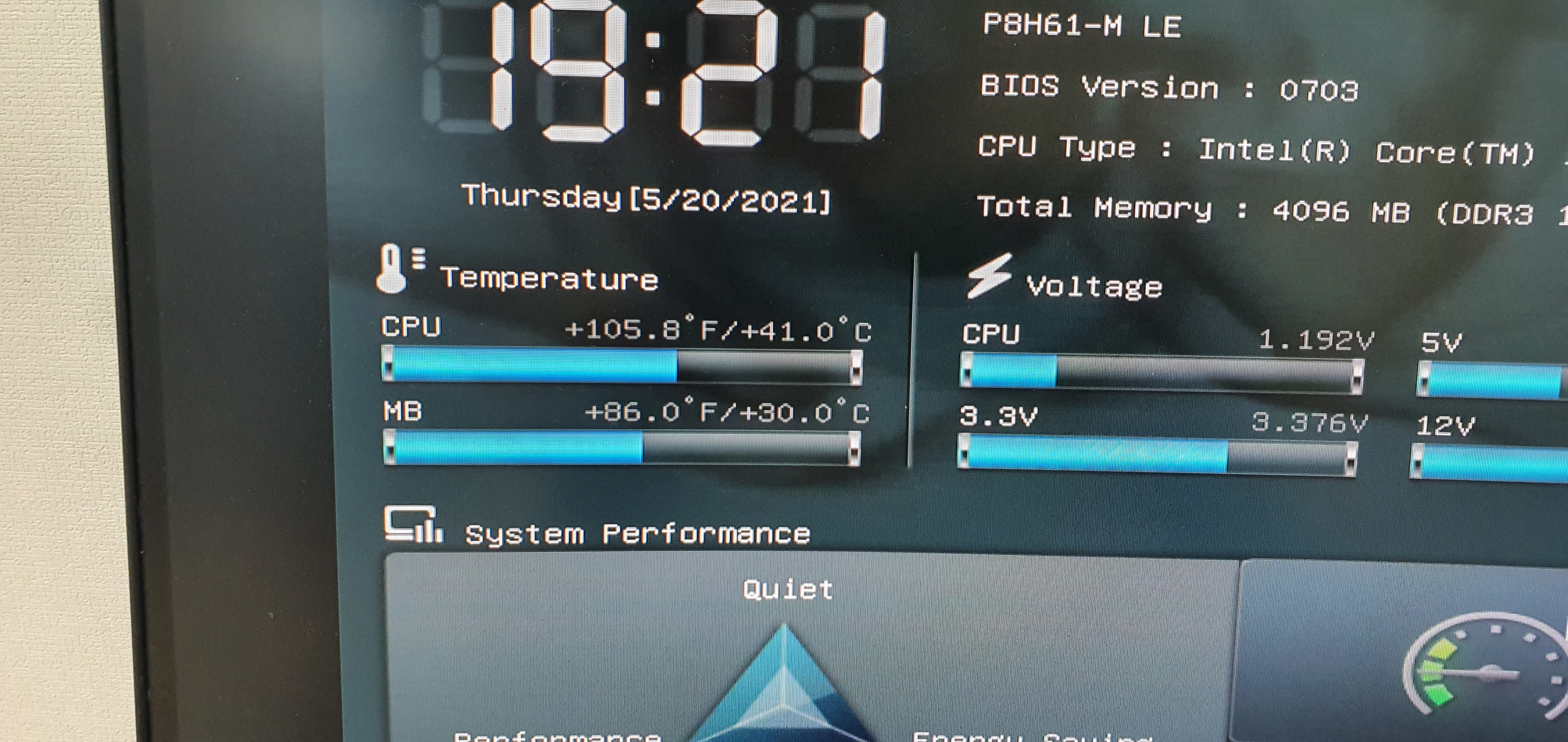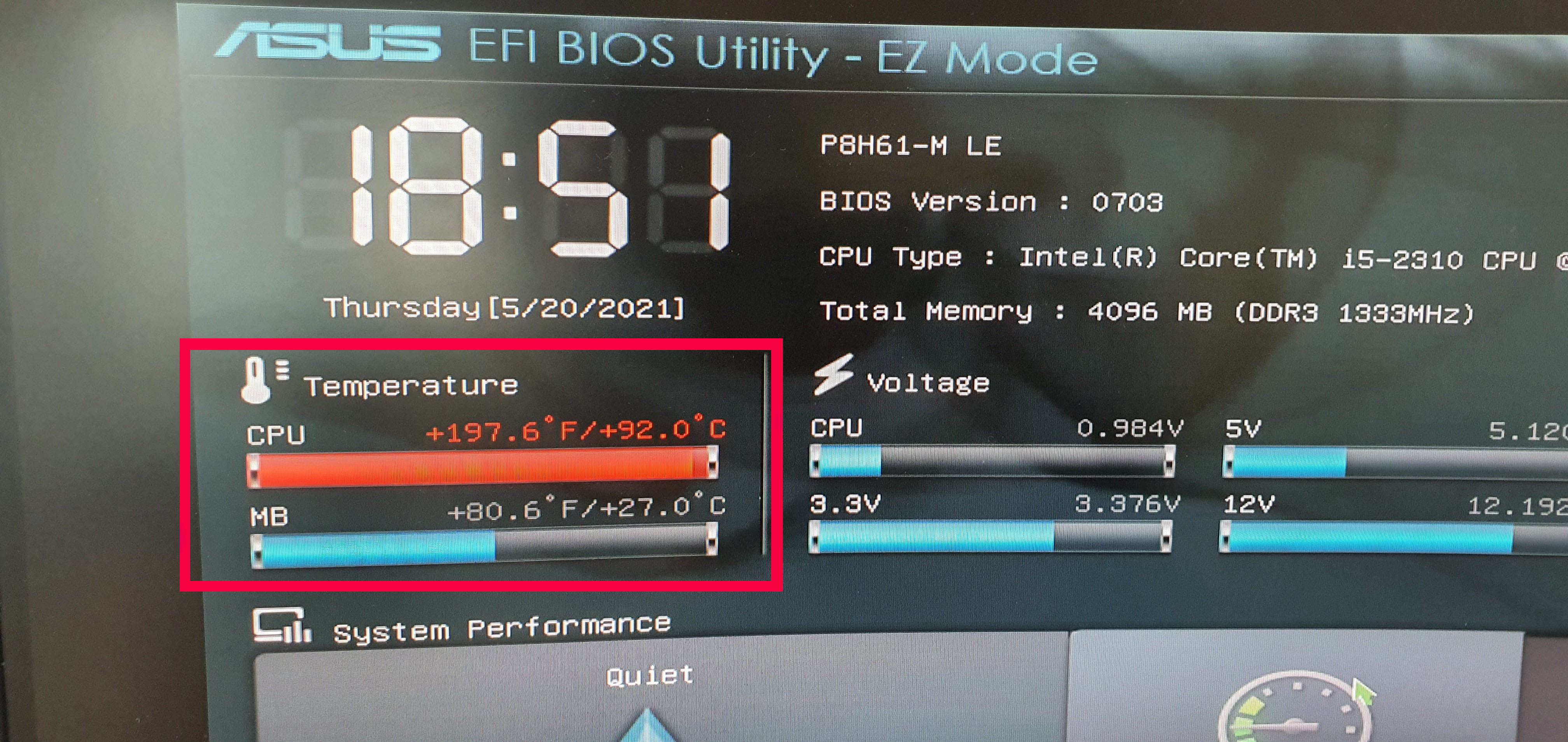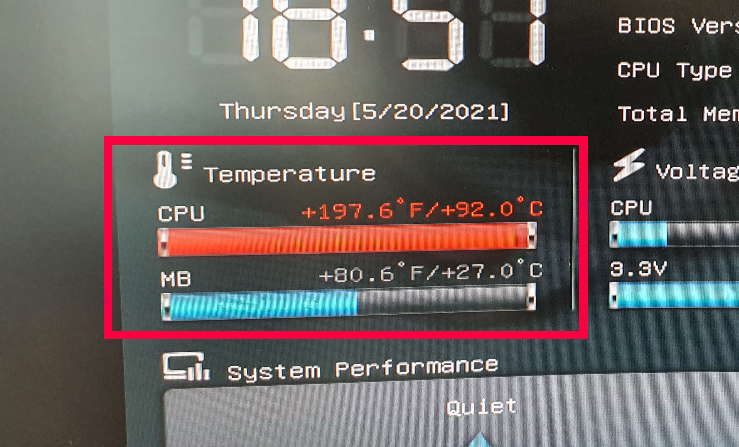 컴퓨터발열을 세부확인하기 위해 바이오스로 진입하였습니다. 들어가자마자 깜짝 놀랄만한 화면이 나타났습니다. CPU온도가 무려 90도 이상으로 나오면서 아래 색과 완전히 다른 적색으로 표시되어 있습니다. 정확하게 평소 CPU온도가 몇도였는지는 기억이 나질 않지만 30 ~ 40도 정도로 나왔던거 같은데 90도는 컴퓨터를 사용하면서 생전 처음보는 CPU온도였습니다. 그래서 CPU쪽에 무언가 문제가 있기 때문에 컴퓨터발열이 생겼구나 생각해서 CPU를 분해를 했습니다.