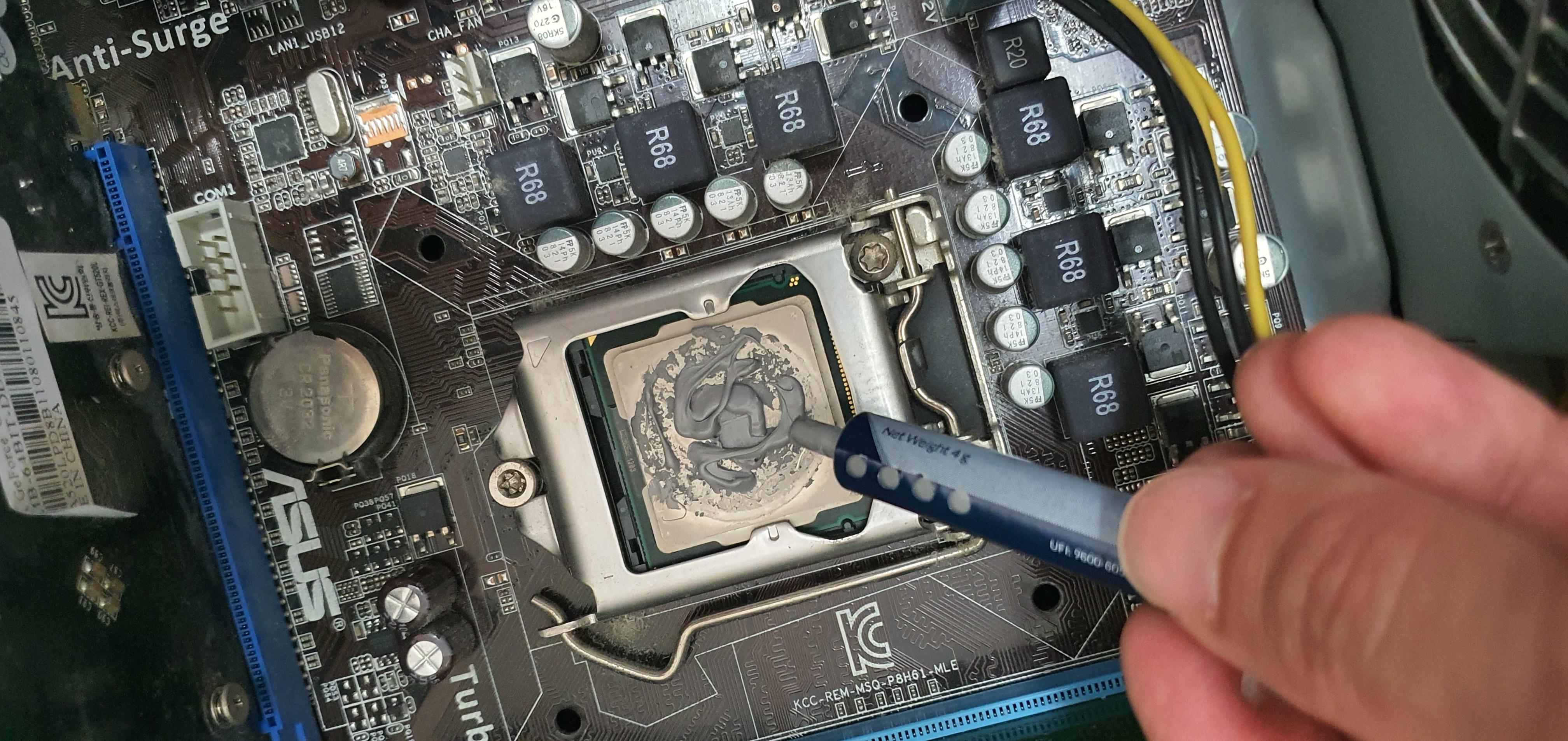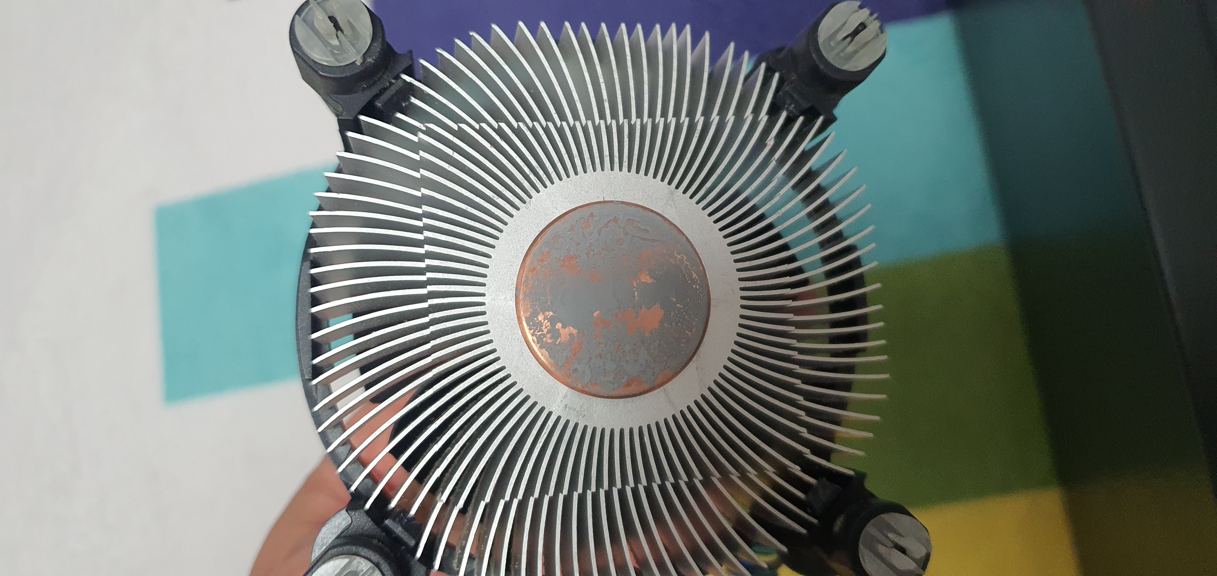 위 사진이 컴퓨터발열의 원인 CPU입니다. 발열판과 밀착되는 부분의 서멀그리스가 발열판 부분과 동일하게 완전히 마른 상태를 보여줍니다. 분해해보니 원인은 CPU와 발열판과 밀착되어 붙어 있어야 하는데 그렇지 않았습니다. CPU와 발열판 사이에 여러 아주 작은 공간이 발생하여 CPU에서 발생하는 열이 발열판으로 온전히 전달되지 않았습니다.