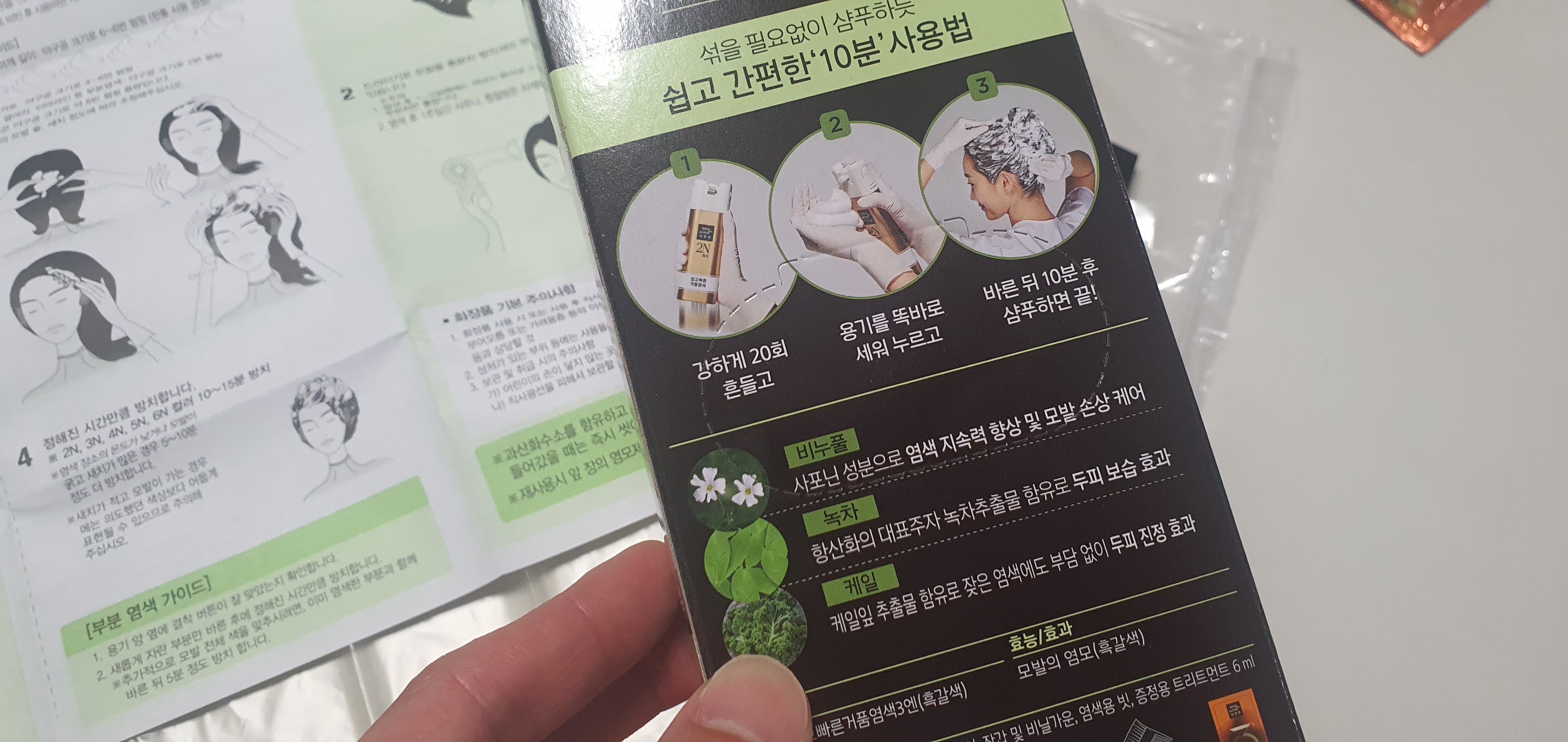 그 다음은 정말 쉽습니다. 정말 샴푸 하듯이 모발을 염색하면 됩니다. 그런데 정말 샴푸처럼 하면 염색약이라서 여기저기 튀거나 모발 이외의 곳에 염색이 될 수 있으니 모발 부분에만 아니면 원하시는 부분에만 샴푸 하듯이 염색을 하면 되겠습니다. 사용한 경험상 염색력이 거품이라고 떨어지지 않고 동일한 효과를 볼 수 있습니다. 그리고 거품으로 염색하는 편리성 이외에 염색약 특유의 냄새가 전혀 없습니다.