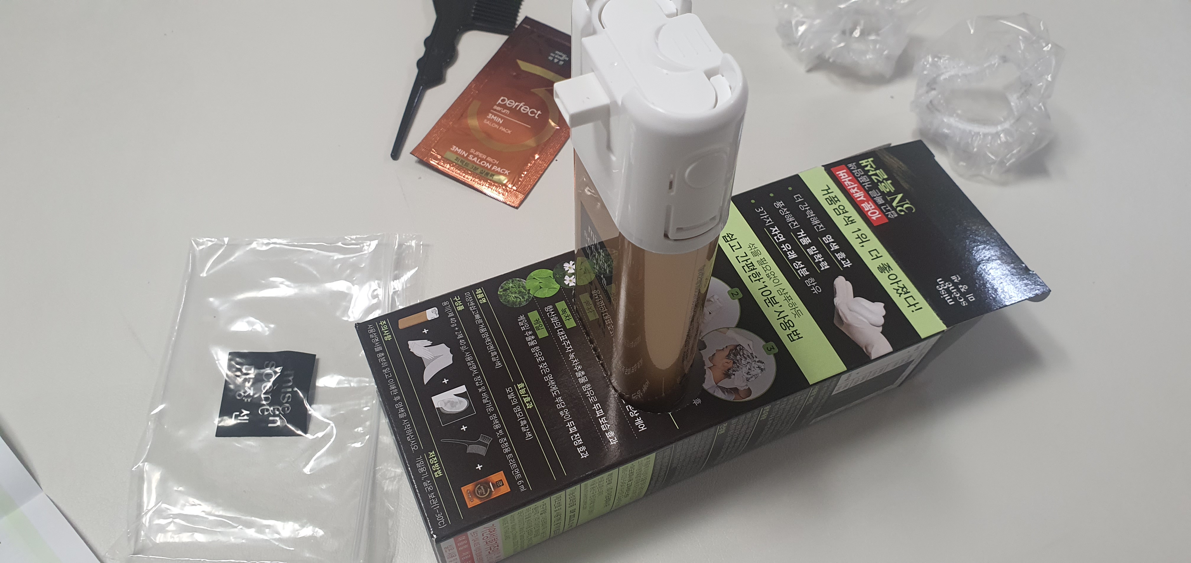 거품 염색약 미장센 제품구성입니다. 포장박스, 장갑과 비닐가운 세트, 빗, 증정용 트리트먼트, 염색약이 담긴 전용 용기 등으로 구성되어 있습니다. 뒤에서 설명서를 보시면 알겠지만 제품 포장 박스는 버리지 마시고 염색약을 다 사용할 때까지 보관하는 것이 좋습니다. 염색시 포장 박스가 역할이 있습니다.