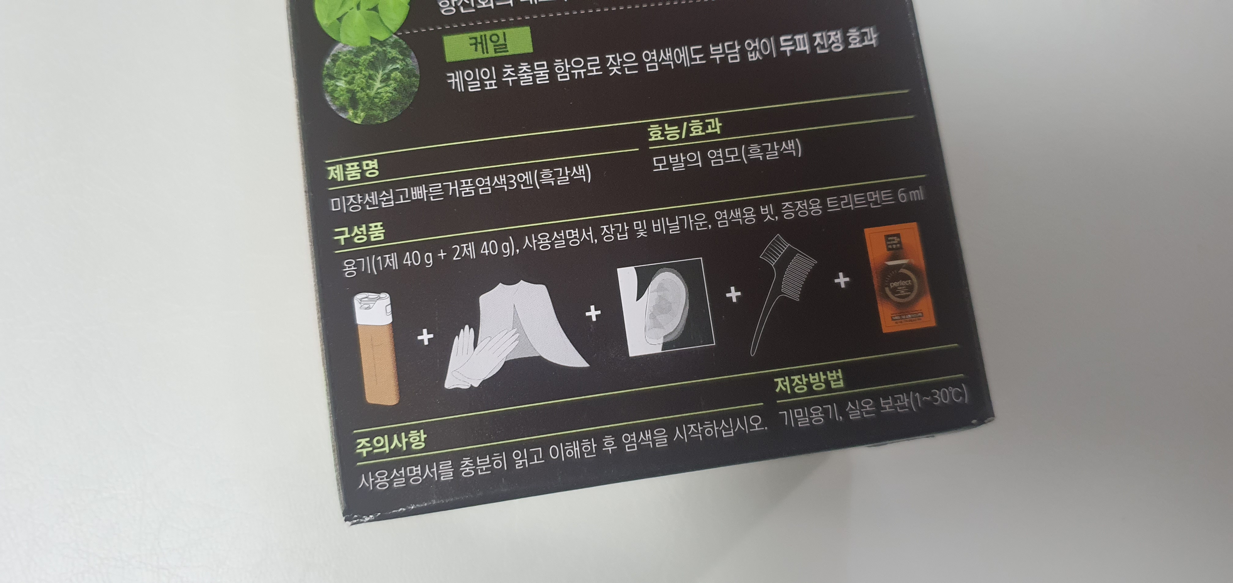 앞에서 염색약 박스를 버리지 말고 위 사진과 같이 사용하기 위해서 입니다. 용기 안에 들어가 있는 2가지 염색약이 잘 혼합되게 흔들은 다음 제품 박스를 뒷면을 보면 점선을 따라서 용기 크기에 맞게 잘려지는 부분이 있습니다. 그 부분에 염색약 용기를 세워서 사용하면 됩니다. 처음 사용시는 박스를 이용해서 사용하시고 지속적으로 사용하시다 보면 세워서 사용하는 것이 익숙해 지면 박스 활용없이 사용하면 되겠습니다.