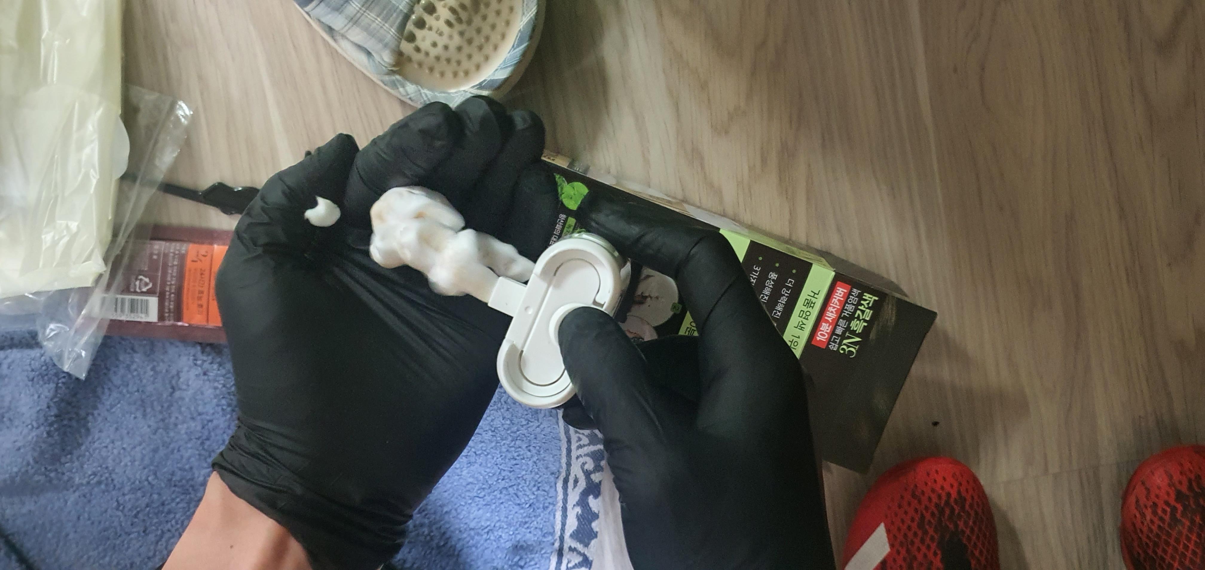 그래서 저는 염색약을 이용할 시에는 위 사진과 같이 손에 그립감이 있고 밀착이 잘 되는 쉐프 장갑을 별도로 구매하여 사용합니다. 염색약이 어두운 색이여서 장갑도 흑색을 사용하면 반복해서 사용이 가능합니다.