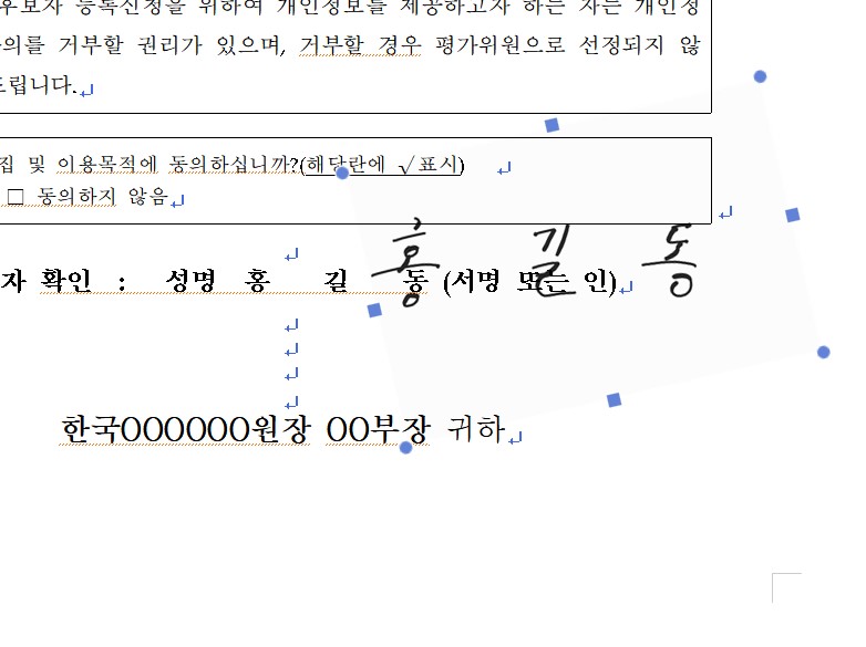 자필서명이 문서 작성 파일 위에 표시됩니다. 온전히 글자만 표시되고 나머지 그림부분은 투명하게 처리됩니다. 그리고 자필서명 그림파일이 크기가 크면 원 또는 사각형 포인트를 마우스로 드래그하여 적당한 크기로 조정하면 됩니다.