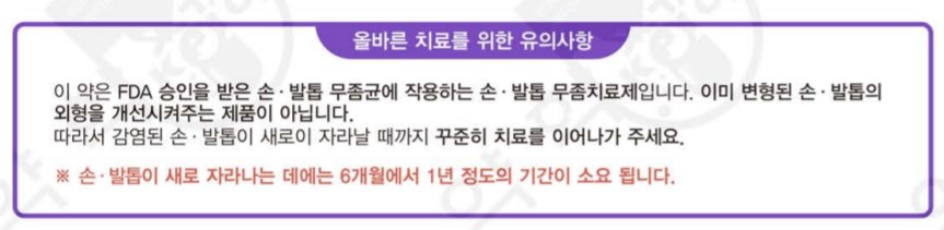 발톱무좀은 몸이 불편한 사항이 아니라 대부분 발관리적인 측면이나 미용상으로 관리되는 사항을 꾸준한 관리가 쉽지 않습니다. 발 노출이 많이 되는 여름철에는 눈에 잘 보이니 관리를 하지만 항상 양말을 착용하고 있으면 지속적으로 관리를 하지 않습니다. 발톱무좀 치료제 주블리아는 FDA 승인을 받은 발톱무좀 치료제입니다. 앞에서 언급했듯이 신발의 잘못된 착용으로 외형을 개선시켜주는 제품이 아닙니다. 그리고 무좀발톱이 새로 자나날 때까지 꾸준한 치료를 해야지 그 효과를 볼 수 있습니다. 그 기간은 6개월에서 1년정도 기간이 소요됩니다. 발톱무좀 치료를 시작을 한지 얼마되지 않아 그 효과는 추후 포스팅 하겠습니다. 지금까지 발톱무좀 치료제 주블리아였습니다. 끝까지 읽어주시고 봐 주셔서 감사합니다.