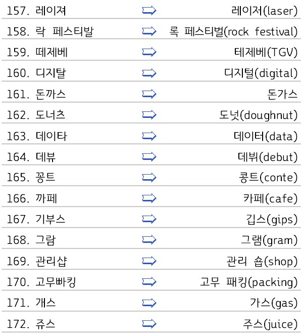 우리나라 고속철도는 프랑스 기술로 도입했습니다. 프랑스 고속철도를 '떼제베'가 아닌 '테제베'로 표기해야 합니다. 예전에 광고에서 아주머니가 얘기하던 '디지탈'은 '디지털'로, 일본에서 건너온 요리 '돈까스'는 '돈가스'로 표기해야 합니다. 프랑스어에서 온 '데뷰'는 '데뷔'로 '까페'는 '카페'로 표기합니다. 외래어표기법에 독일어도 있는데 골절되면 하는 '기부스'는 '깁스'로 표현합니다. 자동차 정비 업소에서 잘 사용하는 고무'빠킹'은 '패킹', '개스'는 '가스'로 작성해서 사용해야 합니다.
