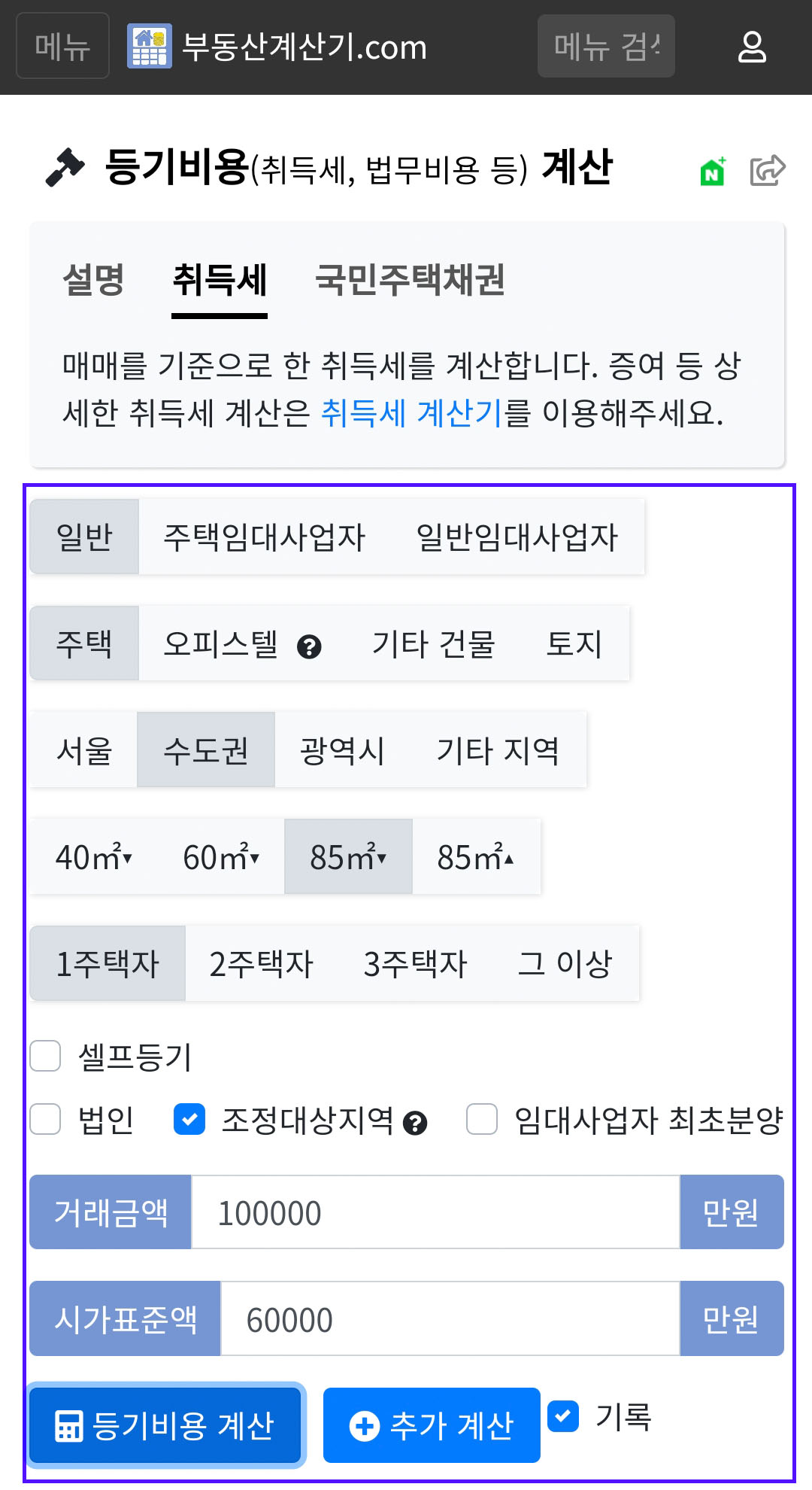 모바일 취득세 계산하기 방법을 추가로 안내해 드리겠습니다. 제가 자주 사용하는 것은 '부동산계산기' 앱입니다. 구글플레이에서 '부동산계산기' 검색하면 위 그림과 같이 나옵니다. 설치 후에 실행하면 '등기비용'을 클릭하면 위 우측 그림과 같이 취득세 계산화면이 나타납니다. 본인의 요건에 맞게 선택 및 취득가액, 시가표준액 등을 입력후 '등기비용 계산'을 클릭합니다.