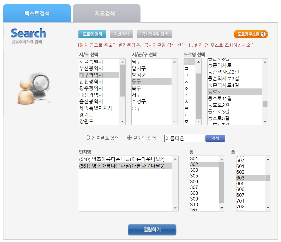 잠깐 시가표준액을 확인하는 방법은 국토교통부에서 운영하는 '부동산 공시지가 알리미'를 통해서 조회해 볼 수 있습니다. 위 그림처럼 크게 텍스트 검색, 지도검색 등으로 선택하여 검색이 가능하고 텍스트 검색에서는 도로명, 지번검색을 선택하여 검색 가능합니다. 그리고 공시지가 기준일을 선택하여 검색도 가능하여 일자에 따른 공시지가 금액의 차이에 대해서도 확인할 수 있습니다. '부동산 공시지가 알리미'를 아래 바로가기 링크를 참고하여 조회해 보시기 바랍니다.