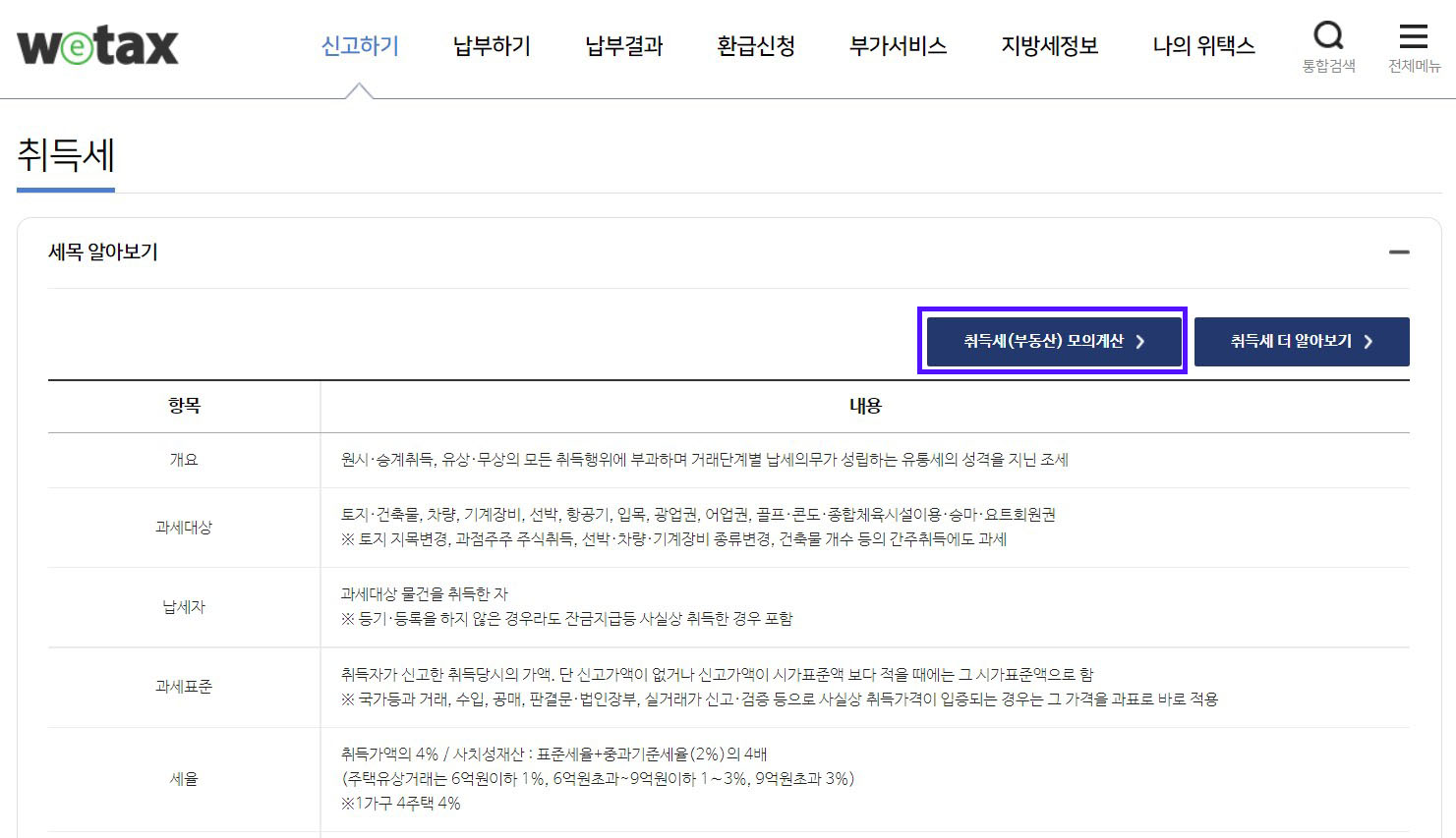 취득세 아래 보면 '세목 알아보기'를 클릭하면 두 번째 그림처럼 중앙부에 '취득세 모의계산' 버튼이 나타납니다. 계산 버튼을 누르면 하단에 위 세번째 그림과 같이 취득하는 부동산에 대한 취득가액을 입력란이 나타납니다.