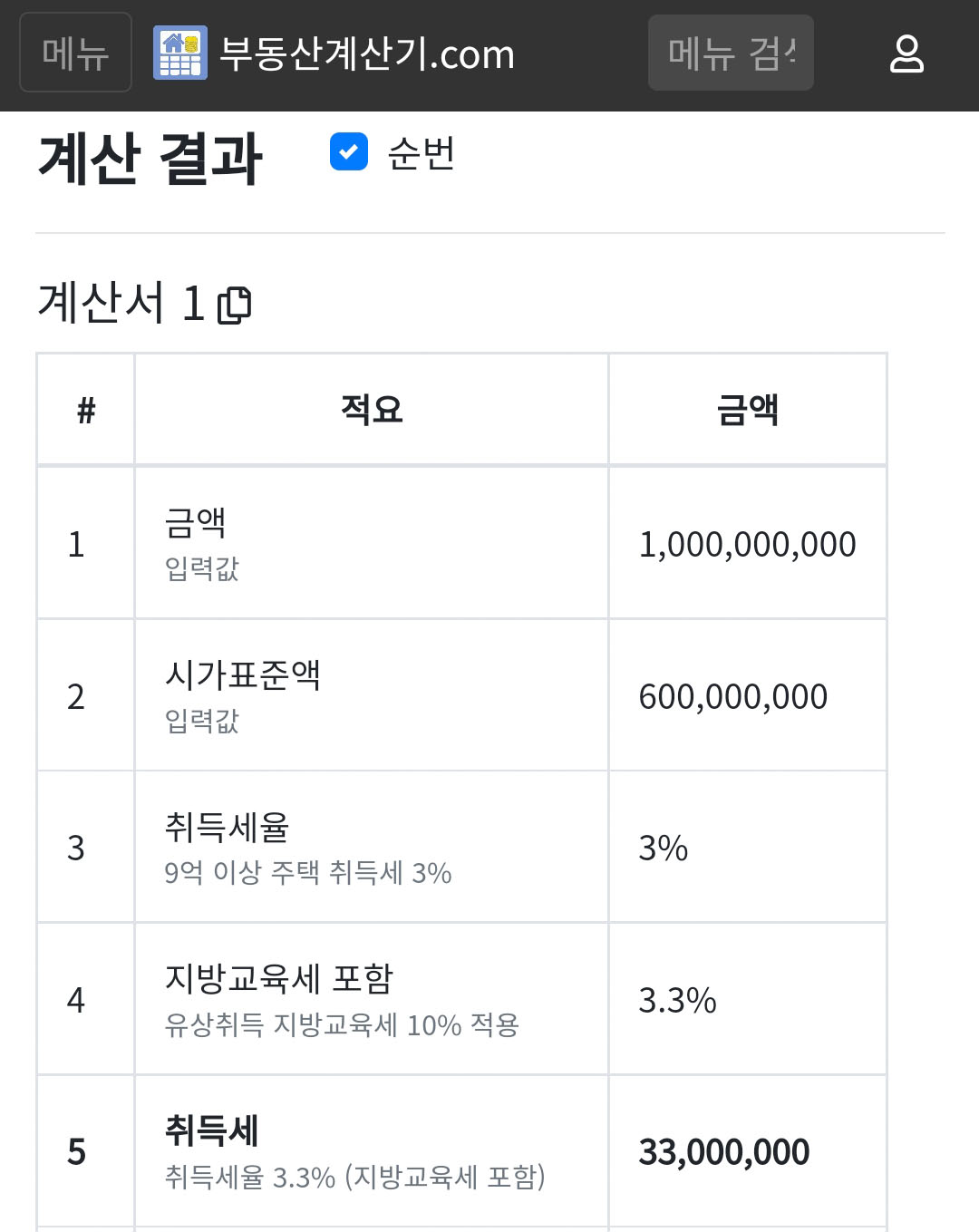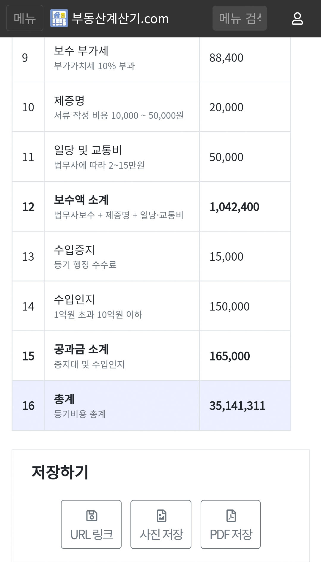 위 그림과 같이 결과 화면이 출력됩니다. 앞에서 위택스에서 계산해 본 것과 동일하에 취득세가 3,300만원이 나옵니다. 취득세 이외에도 법무사비용, 수입증지, 수입인지 등 추가 세부 항목에 대한 비용을 확인할 수 있습니다. 맨 하단 저장하기에서는 저장 기능이 있어 원하는 방법으로 저장하여 추후 참고 또는 활용이 가능하겠습니다.