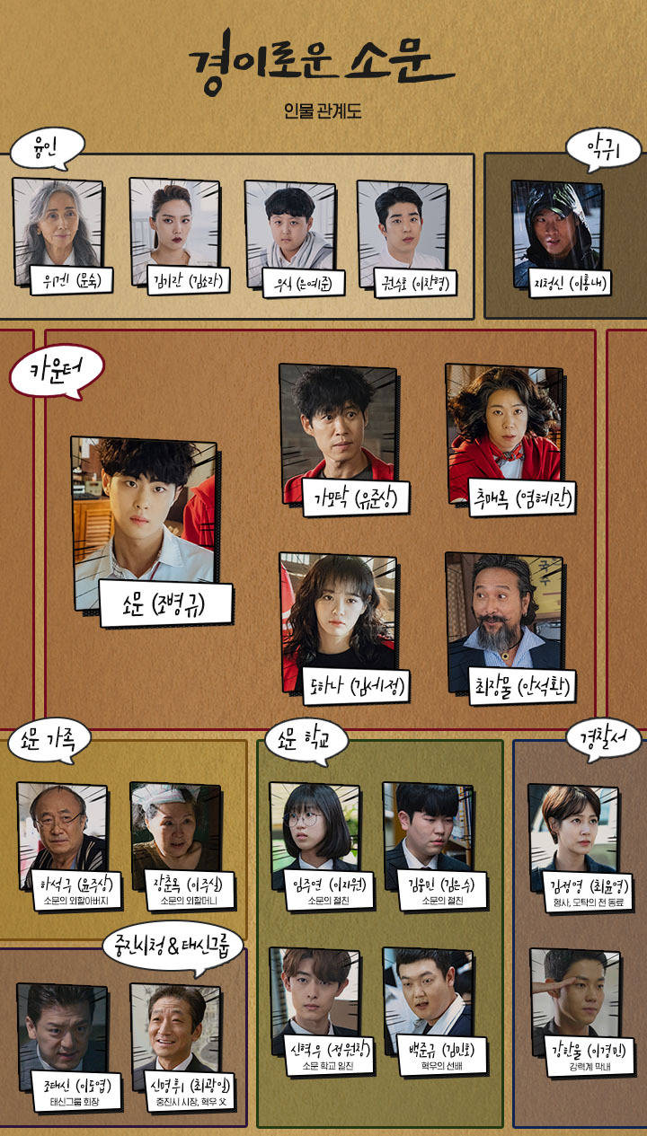 <경이로운 소문>은 앞서 줄거리에서 얘기한 것과 같이 사건이 관계가 복잡한 만큼 공간 개념과 인물관계가 다양하게 구성되어 있다. 그리고 원작 자체가 동일명의 웹툰이어서 그런지 다양한 상상력을 잘 구성해 놓았다. 그러한 개념과 관계를 사전에 알고 보아도 괜찮을 것 같다. 먼저 '카운터'를 관리하는 '융인'이 있다. 소위 우리가 보통 말하는 '저승사자'라고 생각하면 된다. 현실인 이승에서 사람들을 괴롭히는 '악귀', 그 악귀를 잡는 '카운터'로 구성되어 있다. 그리고 소문 주변 인물로 소문 가족 할아버지, 할머니 그리고 소문의 학교 친구들이다. 줄거리에서 언급한 3개의 사건에 중심에 있는 '중진시청'과 '태신그룹'이 있으며 이와 관련된 사건 꼬리를 계속 무는 중진시 '경찰서' 인원들로 이야기는 펼쳐진다.