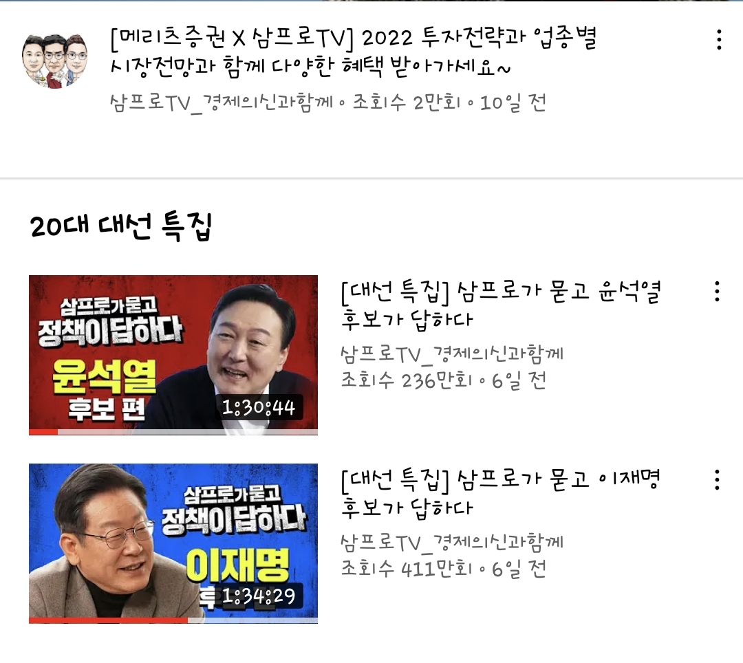 국내 유명 유튜브 채널인 삼프로TV에 이재명 후보와 윤석열 후보가 출연했습니다. 여기서 인터뷰한 내용에 대한 비교는 논란의 소지가 있기 때문에 조회수만을 가지고 비교해 보겠습니다. 왜냐하면 타 포스팅의 내용은 인터뷰한 내용을 가지고 정리하였다면 그보다 더욱 정량적으로 명확한 조회수만을 가지고 분석했습니다. 먼저 현재 포스팅을 작성할 때 두 동영상의 조회수는 윤석열 후보 234만회, 이재명 후보 407만회입니다. 윤석열 후보의 인터뷰 동영상이 이재명 후보의 동영상보다 약 40%가량 저조하게 보입니다. 현재 이동영상은 삼프로TV 채널 제일 상단에 올려져 있습니다. 더군다나 모바일 플랫폼 기준으로 윤석열 후보의 인터뷰 동영상이 이재명 후보의 동영상 보다 위에 링크되어 있습니다.