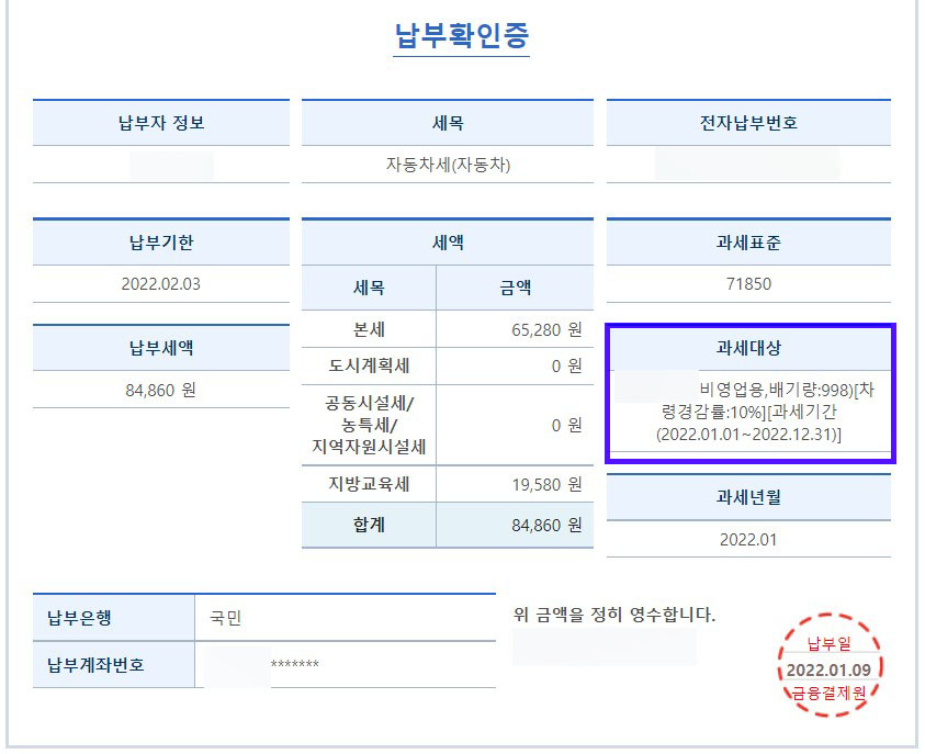 최종적으로 납부하기를 클릭하면 우측 그림과 같이 납부확인증이 나옵니다. 1,000cc 미만의 경차여서 자동차세가 굉장히 저렴합니다.