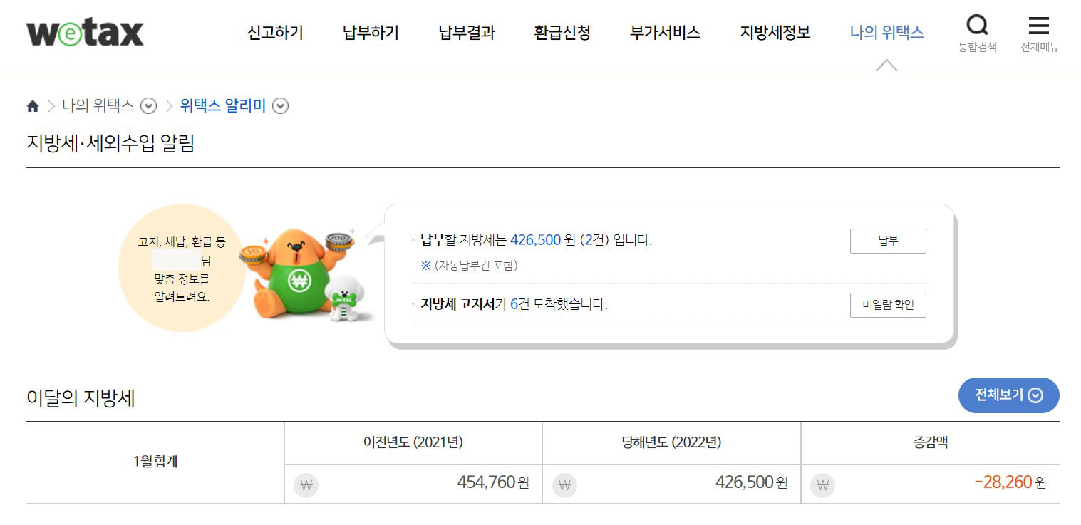 앞선 절차에서 자동차세연납 신청이 완료되면 납부를 할 수 있습니다. 위택스 상단 메뉴에서 '납부하기'에서 '지방세'를 선택하면 신청된 자동차세연납이 나타납니다. 저는 5년된 SUV와 3년된 경차가 있게 2건이 나왔습니다.