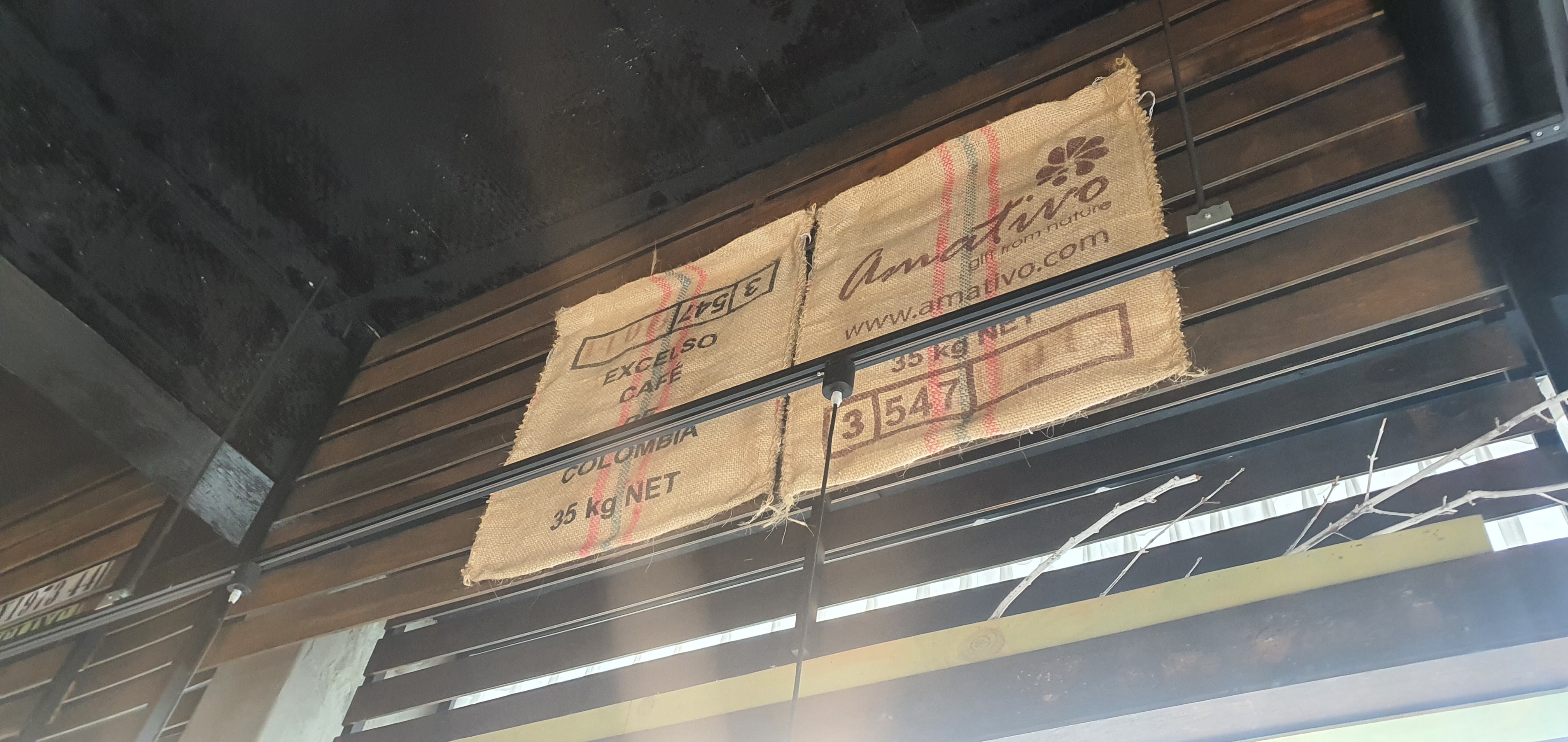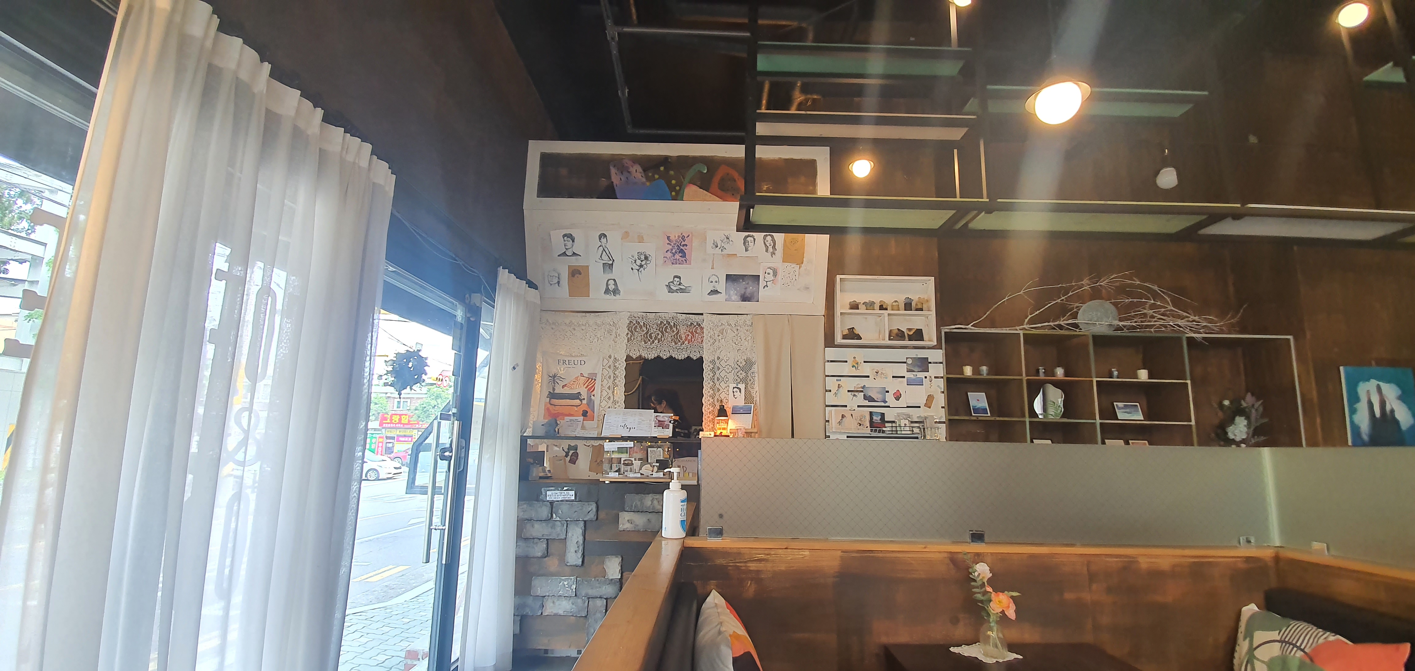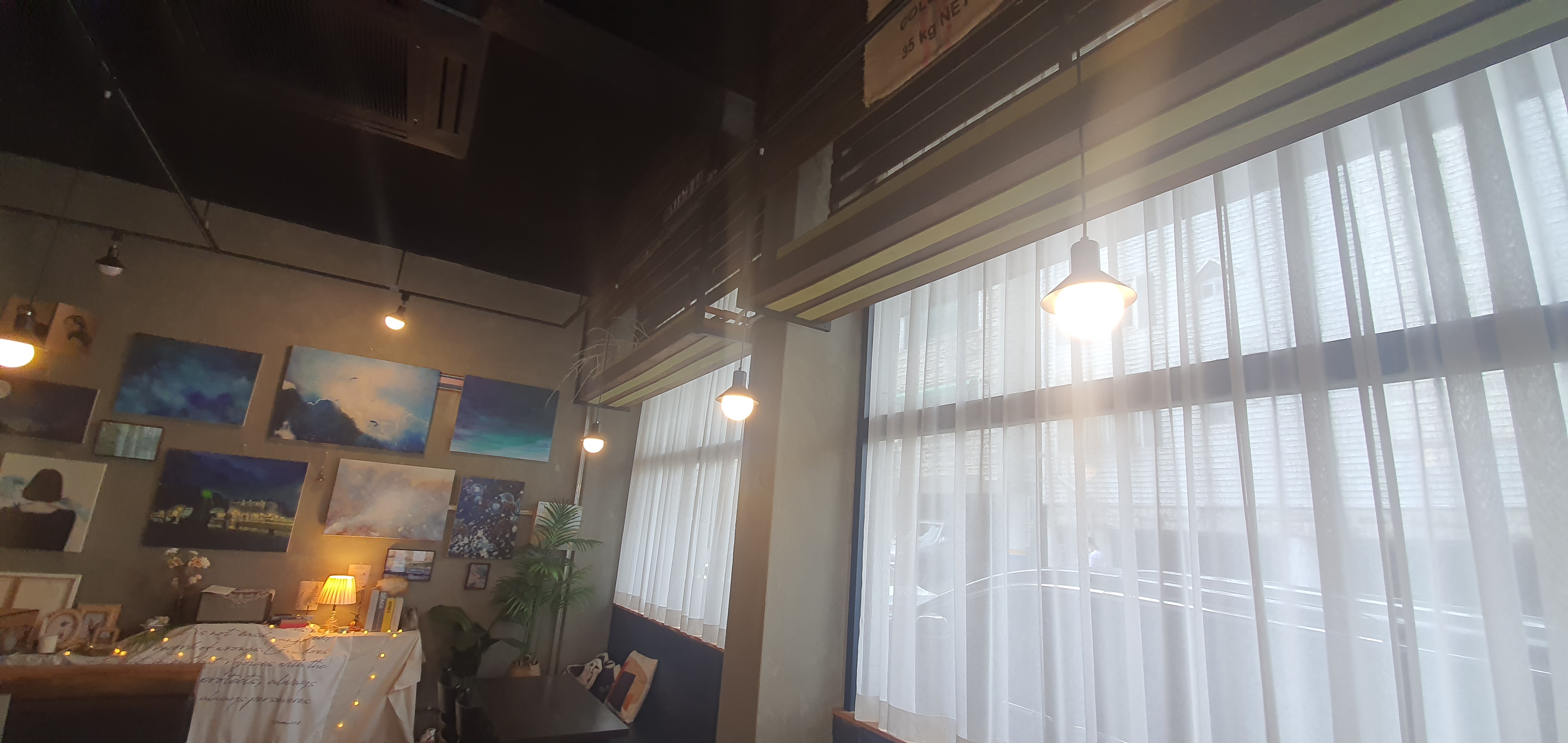 조명이 크고 화려하지는 않지만 감성카페 분위기에 맞춰 작고 아담하며 따뜻한 느낌이 전달됩니다. 한낮에 방문을 하였는데 하늘 거리는 커튼 배경인데도 실내를 조금 어둡게 연출하여서 인지 예쁘게 촬영되었습니다. 제가 앉아 있는 높은 벽면에는 자루인지 포대가 붙어 있습니다. 영어로 되어 있는 외국 자루는 벽면에 걸어도 감성 느낌을 전달합니다.