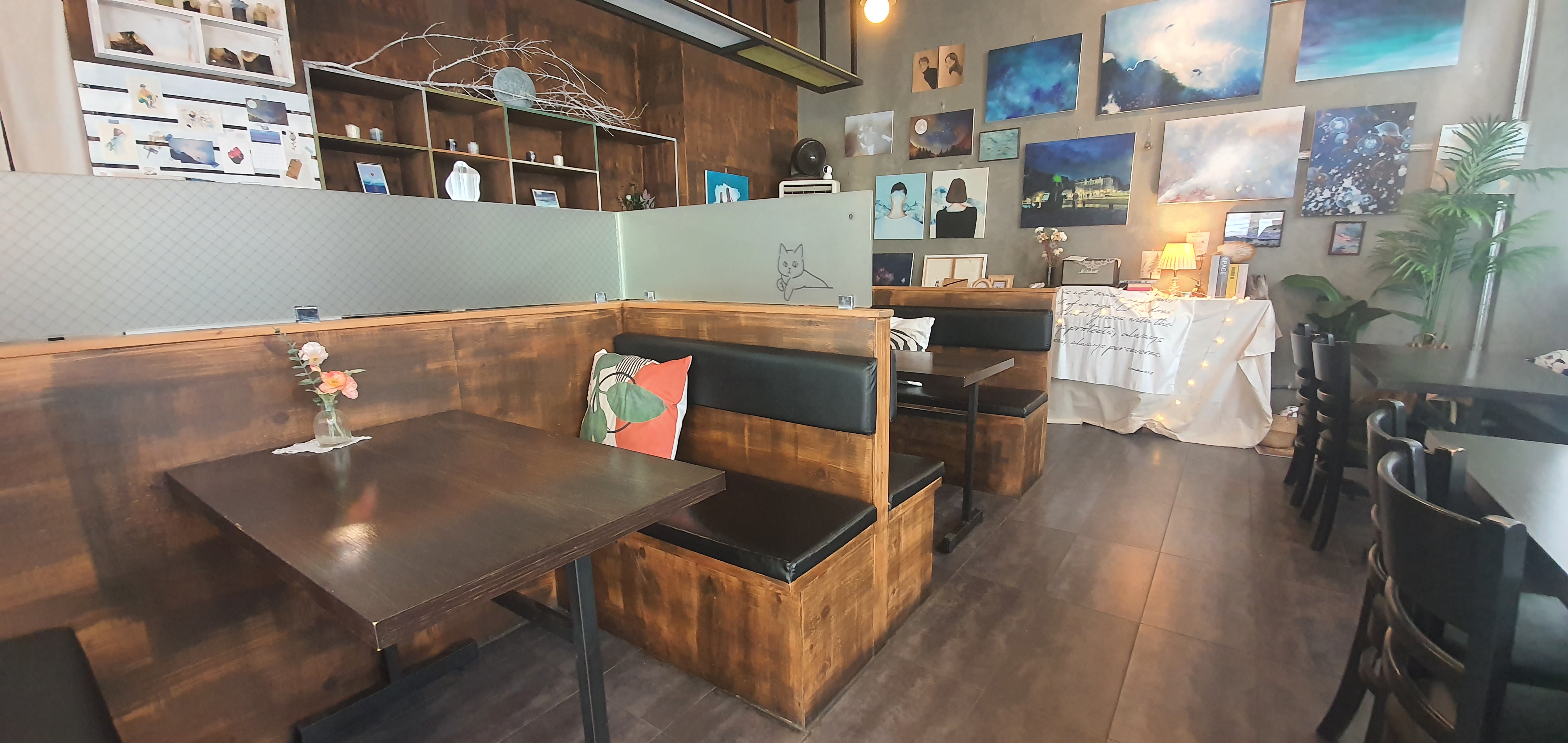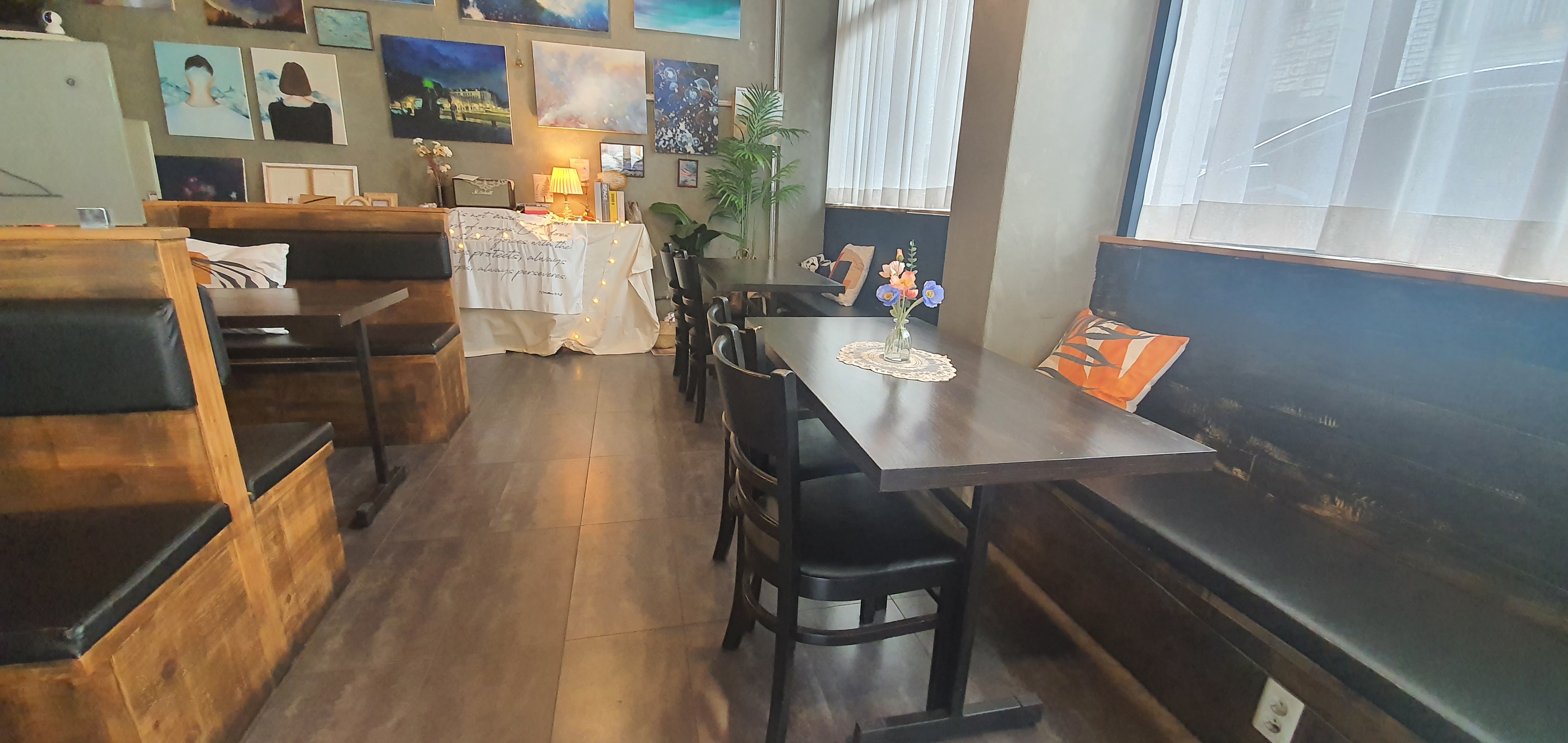 감성카페 마이로는 위 사진과 같이 좌석은 2가지 형태로 있습니다. 하나는 등받이가 있는 벤치체어와 개별 의자로 구성되어 있습니다. 벤치체어 나무가 균일하지 않는 톤으로 어두운 듯 하면서 밝게 표현되어 있어 다소 전체적인 인테리어 구성이 무거운듯 하면서 너무 무겁지 않습니다. 테이블에 포인트가 될 만한 꽃병과 받침이 있어 심심하지 않습니다.