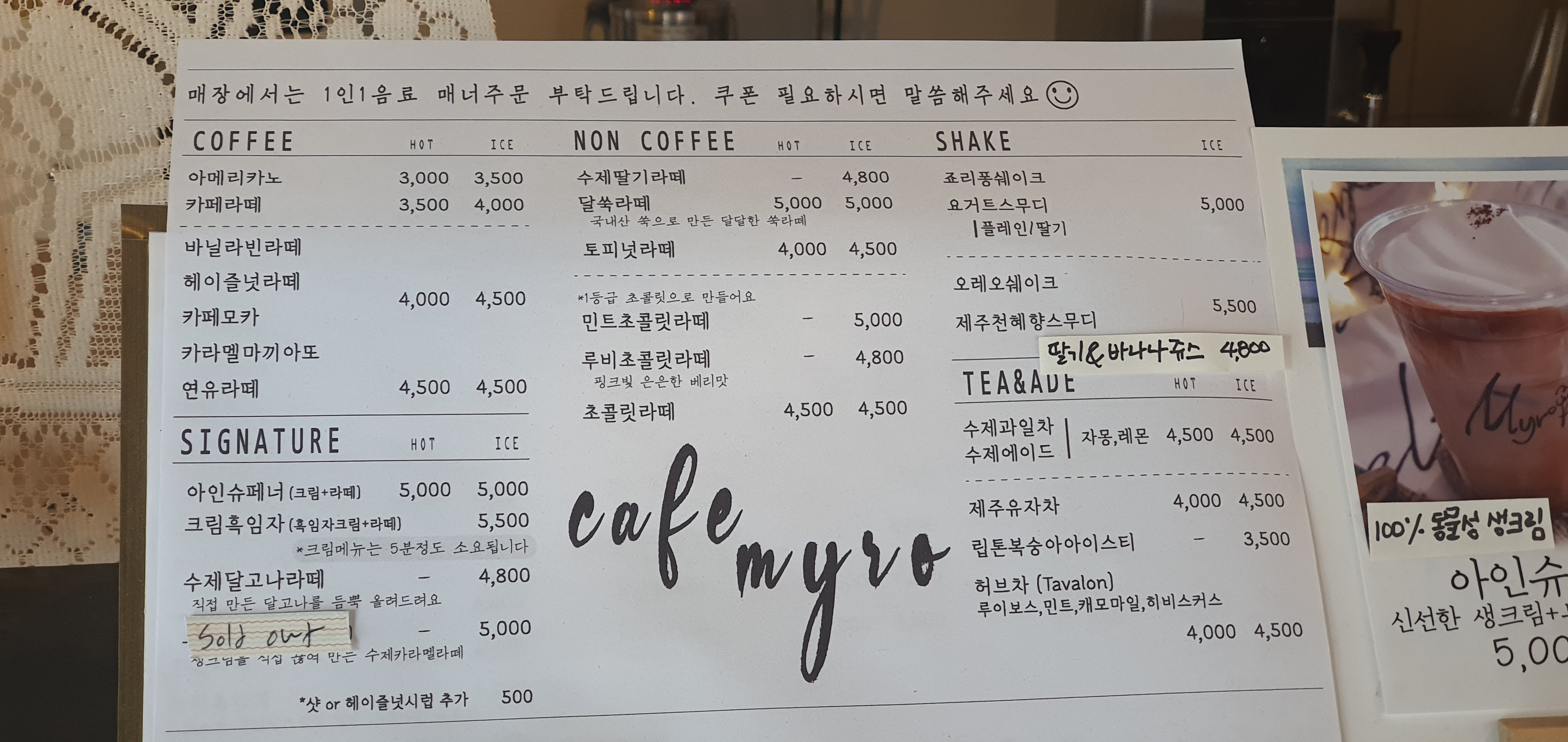 감성카페 부평 마이로 메뉴입니다. 저는 식사 직후여서 커피만을 마셨는데 여기는 다른 분들은 쿠키가 정말 맛있다고 칭찬하시는 분들이 많았습니다. 커피값은 중위대 커피 가격을 찾기 힘든데 부평 마이로 카페가 가격대가 중간으로 보입니다. 메뉴판 상단에 보시면 1인 1음료 매너주문 안내사항 있으며 쿠폰적립 가능합니다. 쿠키가 눈으로만 보아도 크기도 크지만 달달함이 그대로 전달 됩니다.