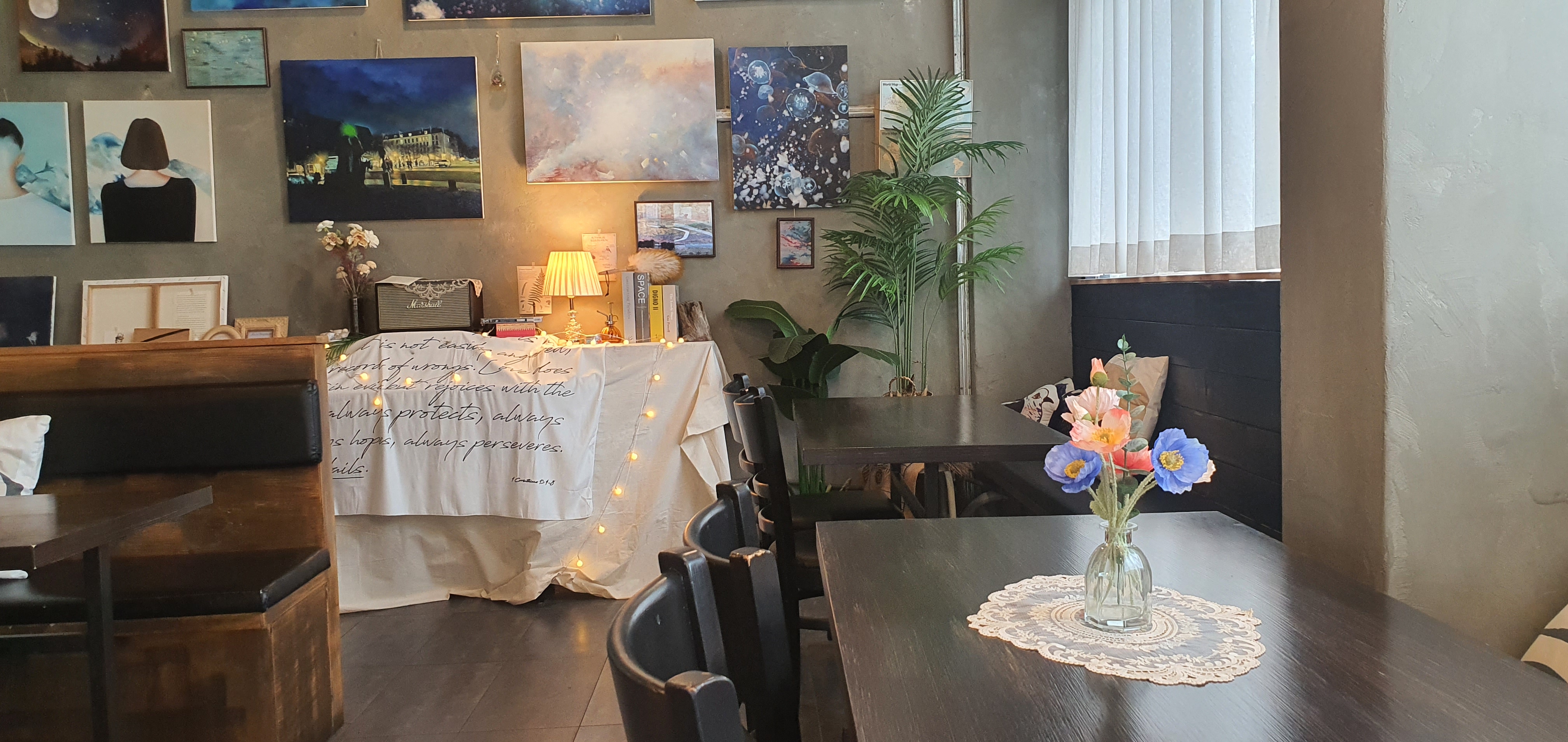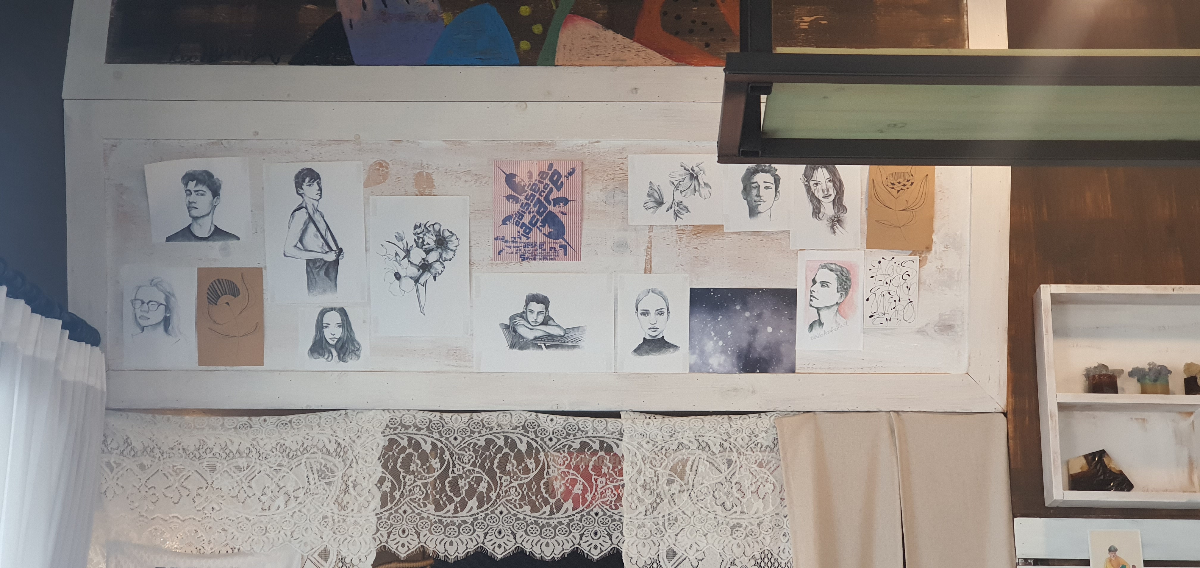 프랜차이즈 커피숍처럼 모던하거나 대형이 아닌 감성카페 부평마이로는 느낌있는 그림이 많습니다. 주인분께서 그림에 관심이 많으신지 차와 음료가 나오는 곳 위에는 데생으로 표현된 인물화가 꾸미지 않은 듯 무심하게 붙여져 있습니다. 좌측 상단에 있는 그림은 한쪽 모서리 부분이 떨어져 있어 감성적인 느낌을 살리기 위해서 연출한 것 같습니다. 요즘 엽서도 보기 힘든데 핸드메이드 인듯한 엽서가 벽면 진열대를 메워져 있습니다.