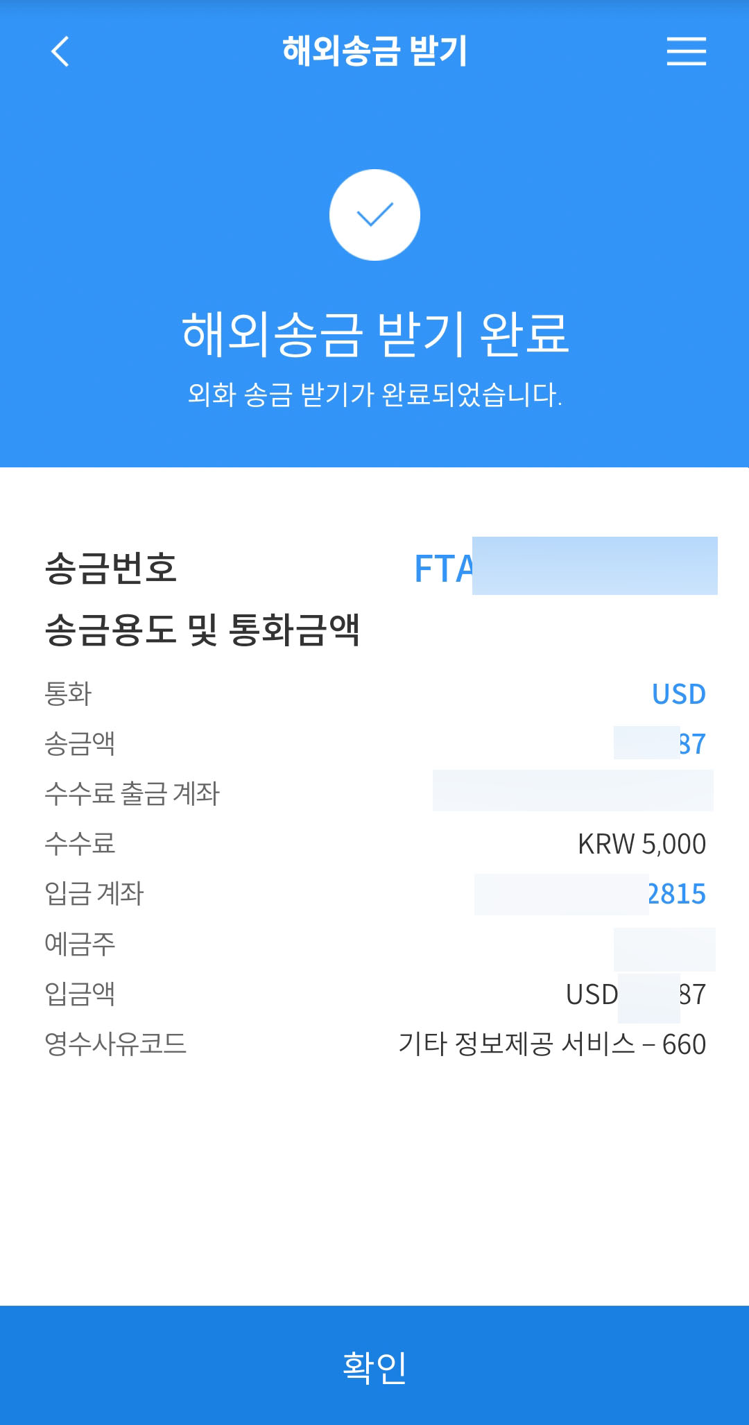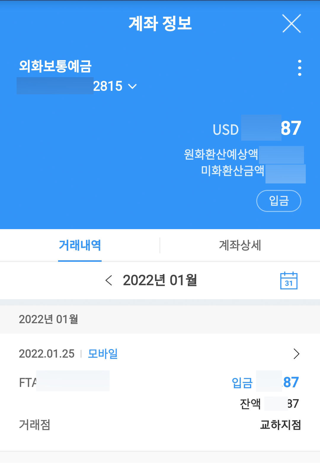 최종적으로 해외송금받기 입력한 사항을 확인하고 하단 '외화송금 받기'를 클릭하면 우측 그림과 같이 '해외송금 받기 완료' 화면이 나타납니다. 앞서 얘기한 것과 같이 수수료가 원화로 5,000원이 지급되었음을 보여줍니다. 다시 외화통장에 대한 조회를 하면 우측 그림과 같이 입금이 확인됩니다. 이번 포스팅은 애드센스 수익 외화통장으로 입금받기 위한 과정을 작성해 보았습니다. 과정이 좀 복잡한 것 같지만 단계별로 천천히 따라 하시면 어려움 없이 진행 될 것으로 보입니다. 끝까지 읽어 주시고 봐 주셔서 감사합니다.