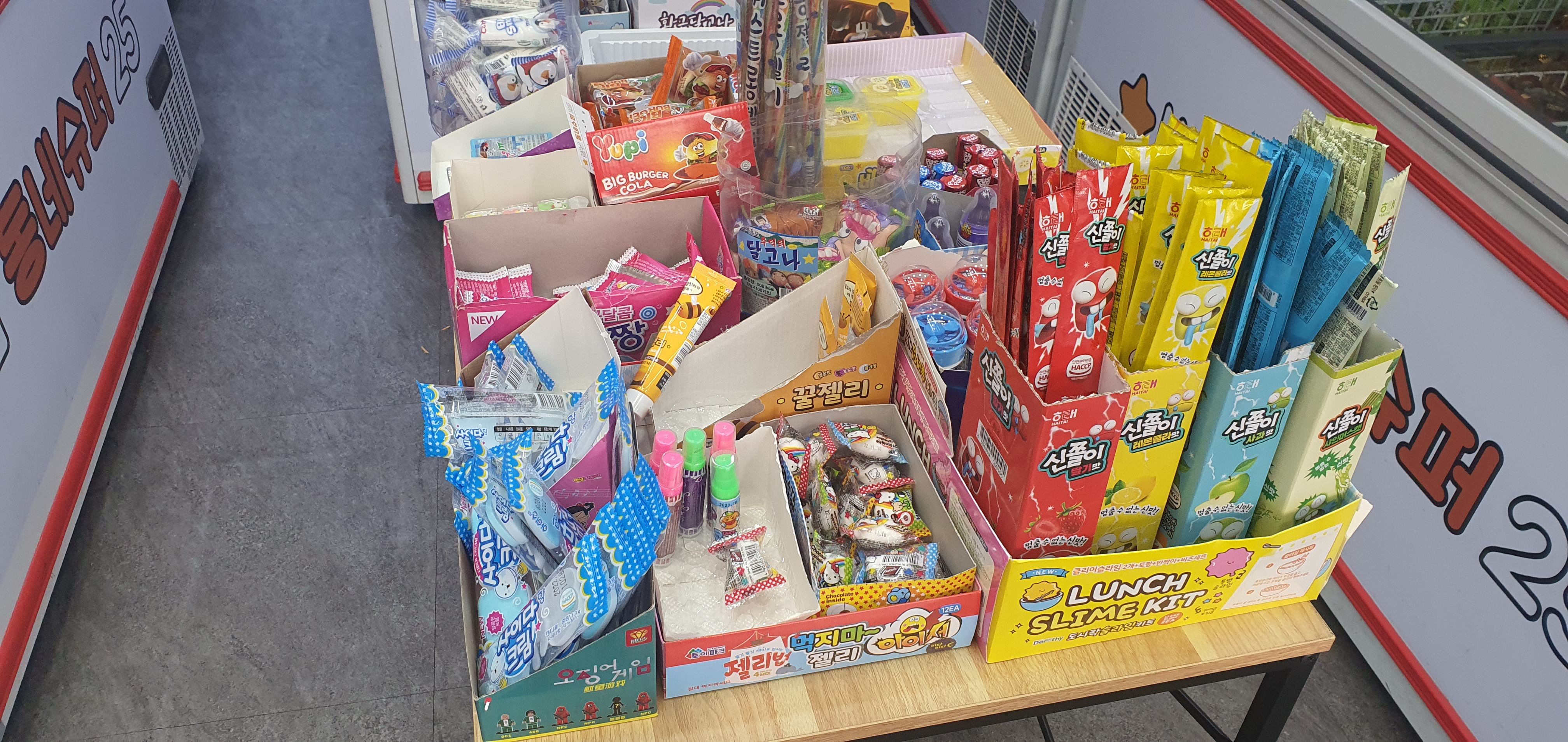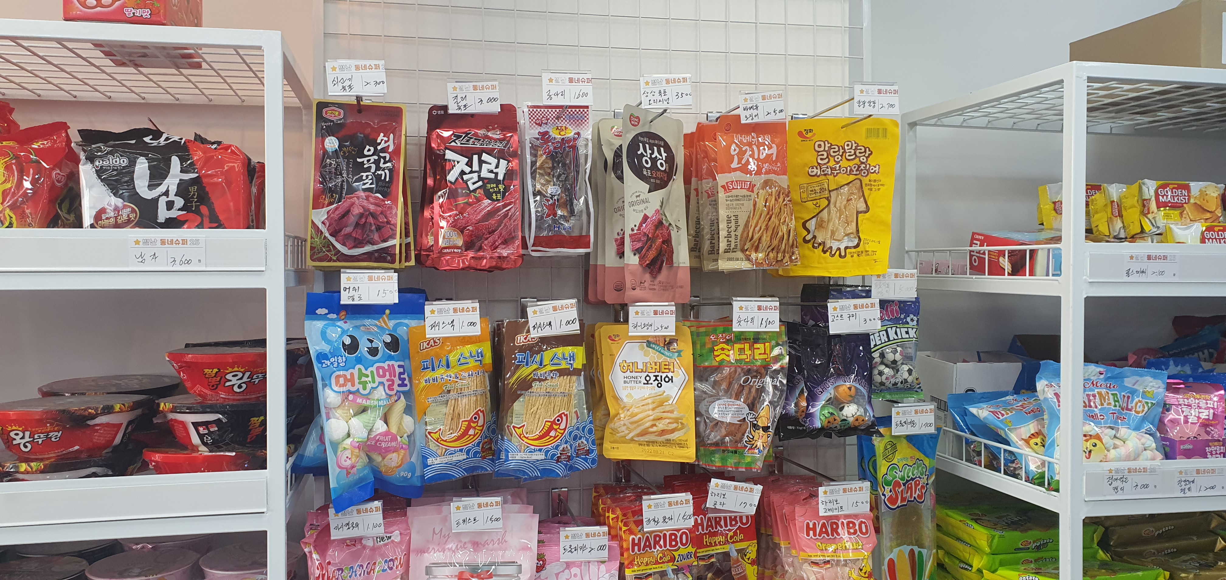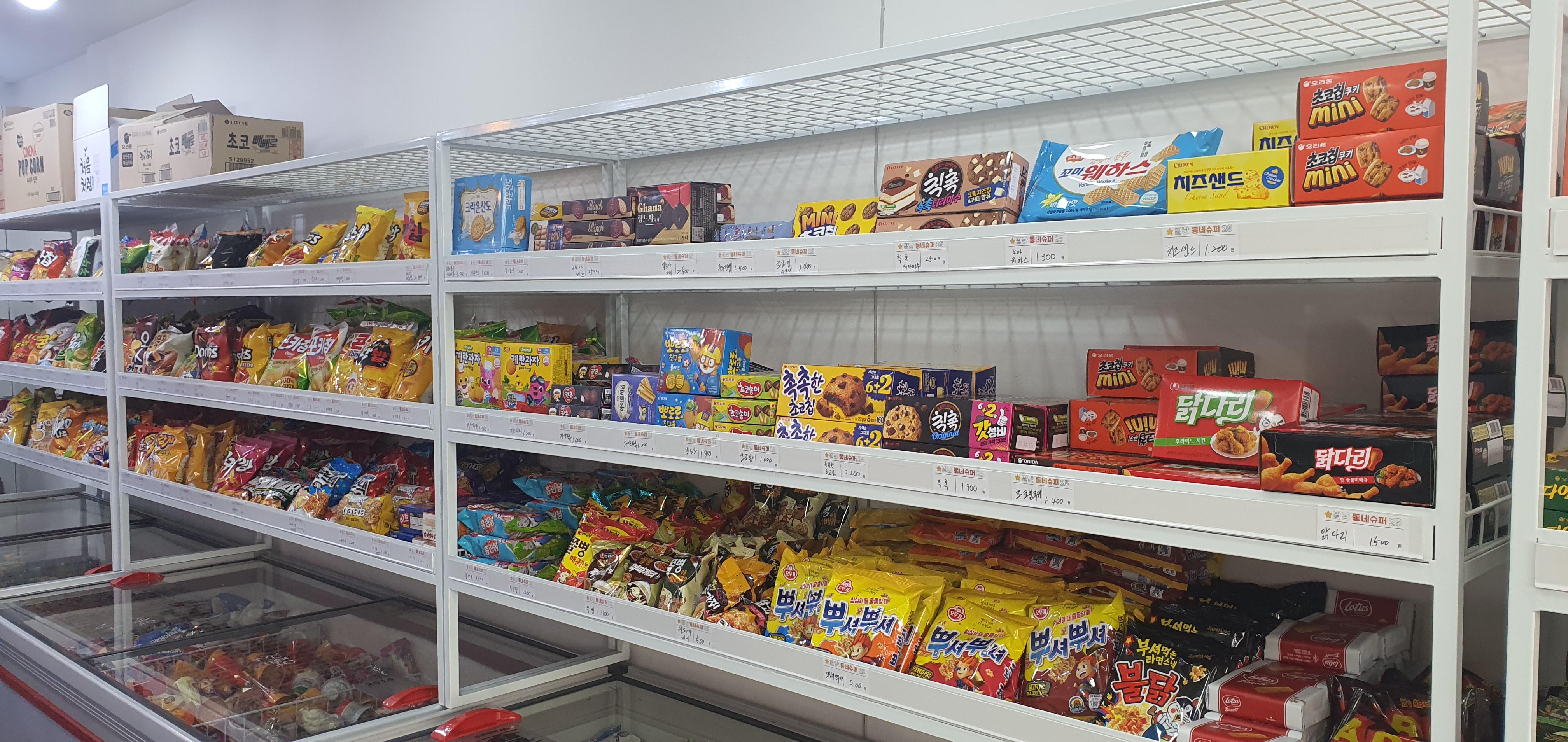 다행이도 어린아이들이 좋아하는 달달하고 새콤달콤한 과자나 젤리류는 눈높이에 맞게 낮은 선반에 위치해 있습니다. 무인슈퍼라 안내해 주는 사람이 없는 만큼 판매 물건을 정리하고 위치하는 것도 매우 많은 고민을 했을 것이 분명합니다.