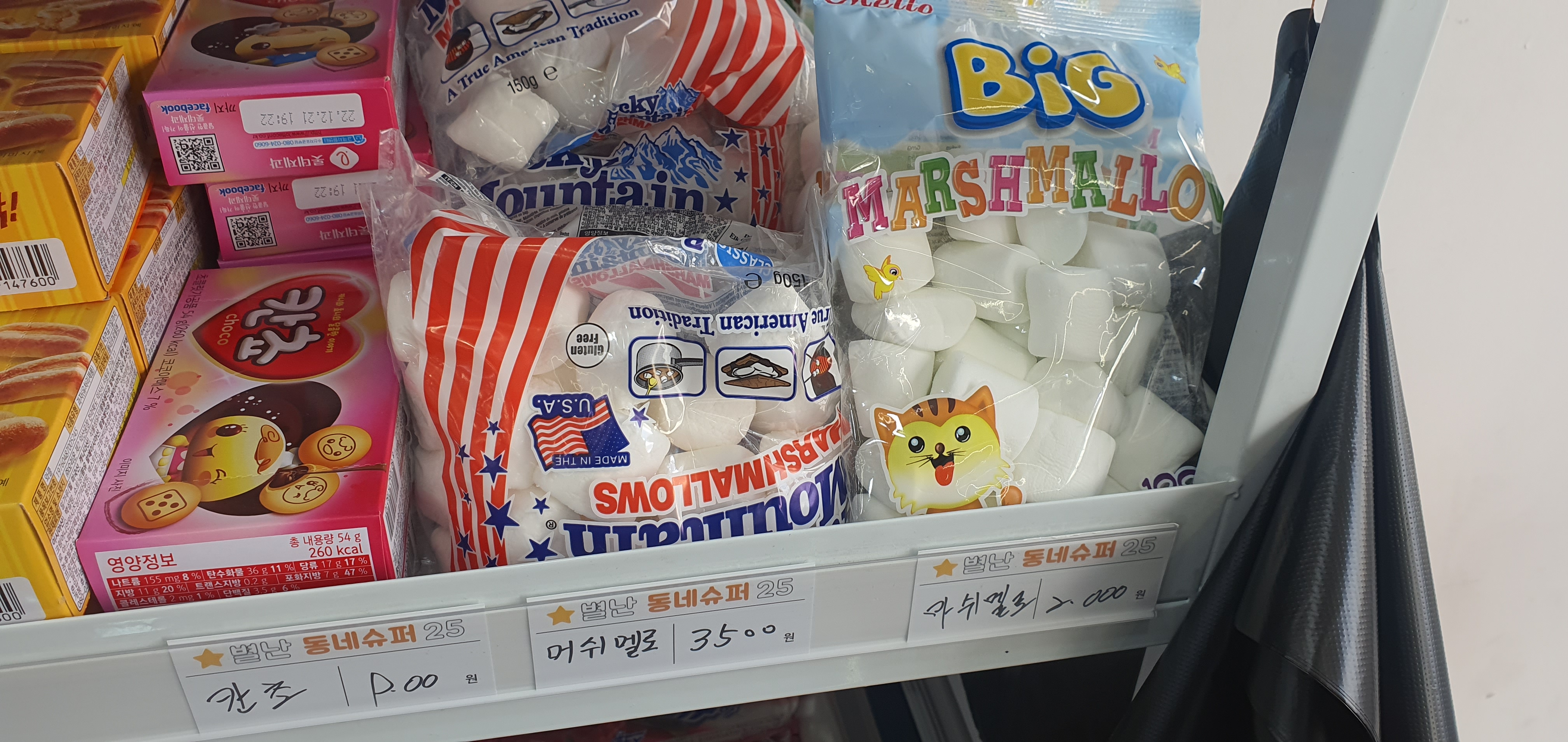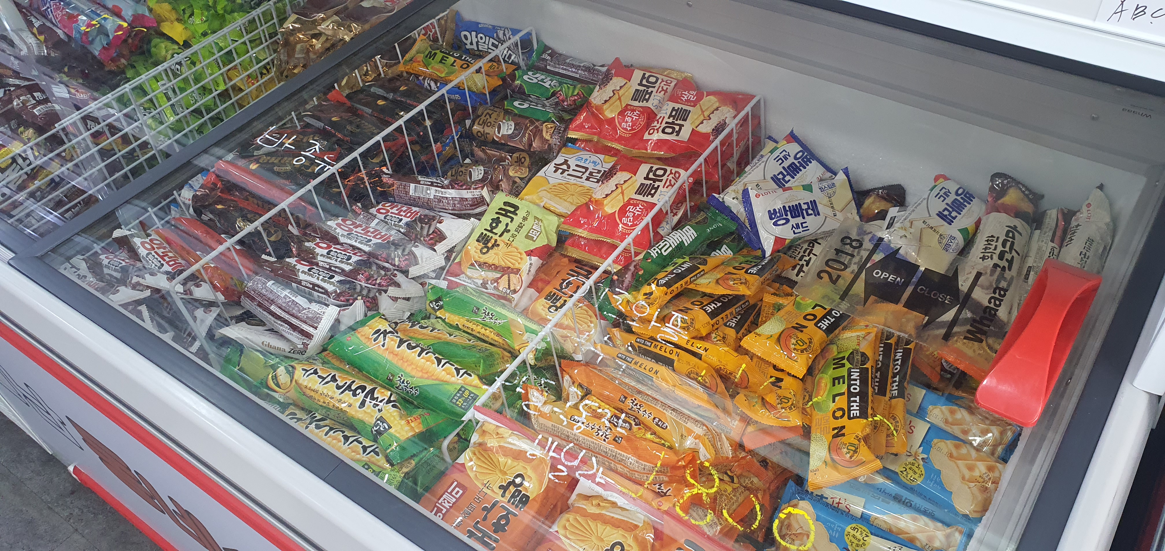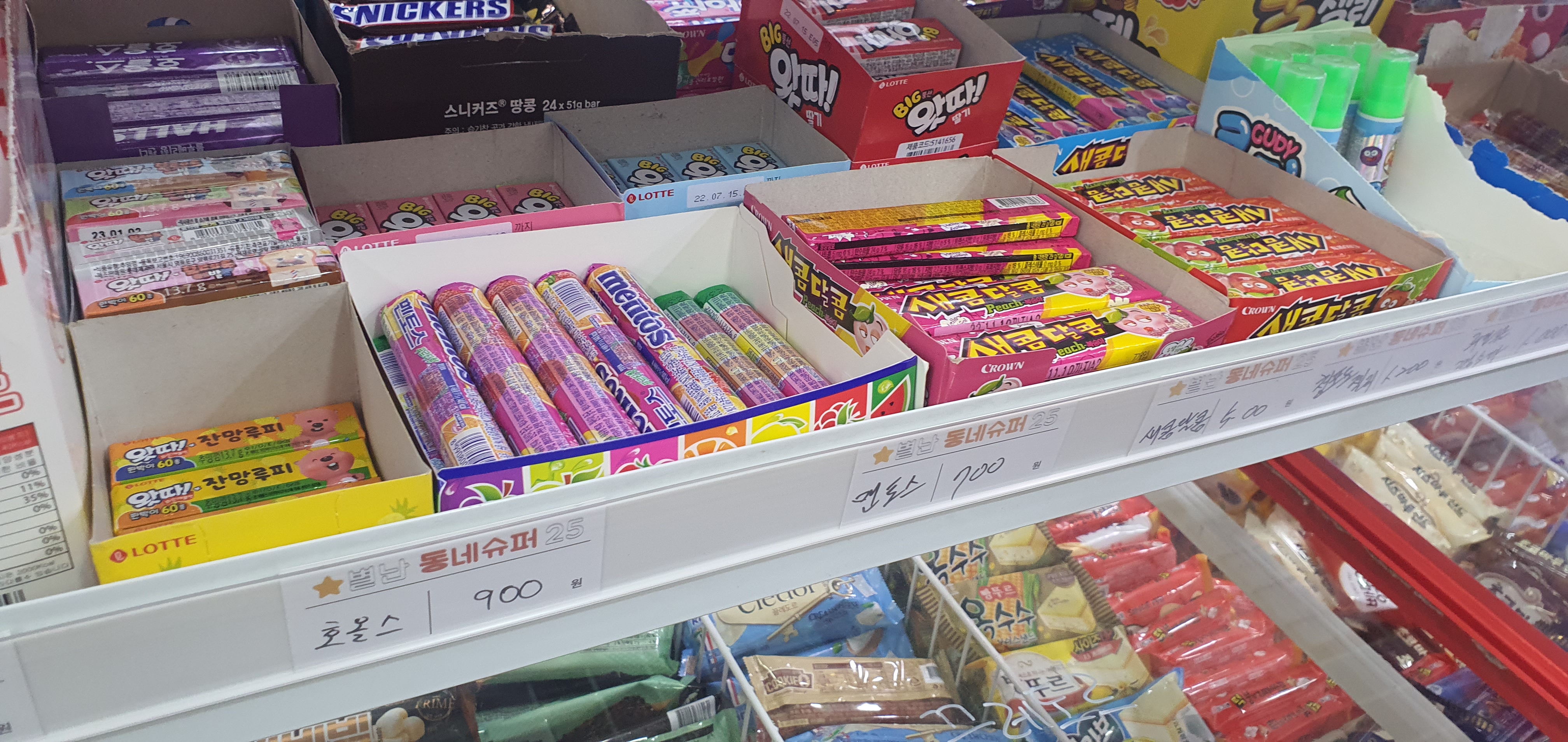 다행이도 어린아이들이 좋아하는 달달하고 새콤달콤한 과자나 젤리류는 눈높이에 맞게 낮은 선반에 위치해 있습니다. 무인슈퍼라 안내해 주는 사람이 없는 만큼 판매 물건을 정리하고 위치하는 것도 매우 많은 고민을 했을 것이 분명합니다.